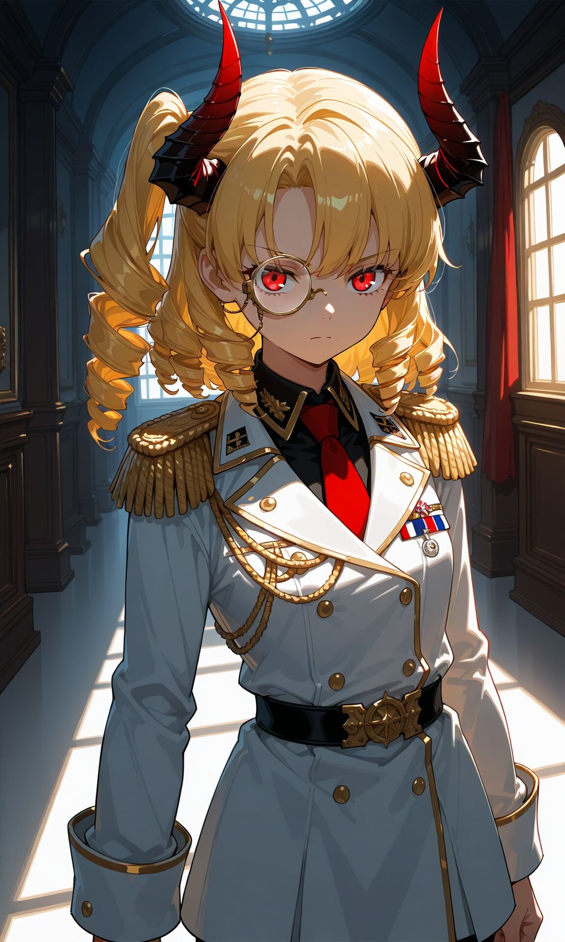 little_1girl, detailed skin, devil_horns, one side up(drill_hair), detailed_hair, medium_hair, blond_hair, detailed eyes, red_eyes, monocle, serious, white_military_jacket, epaulettes, black_shirt, red_necktie, , indoors, cowboy shot,