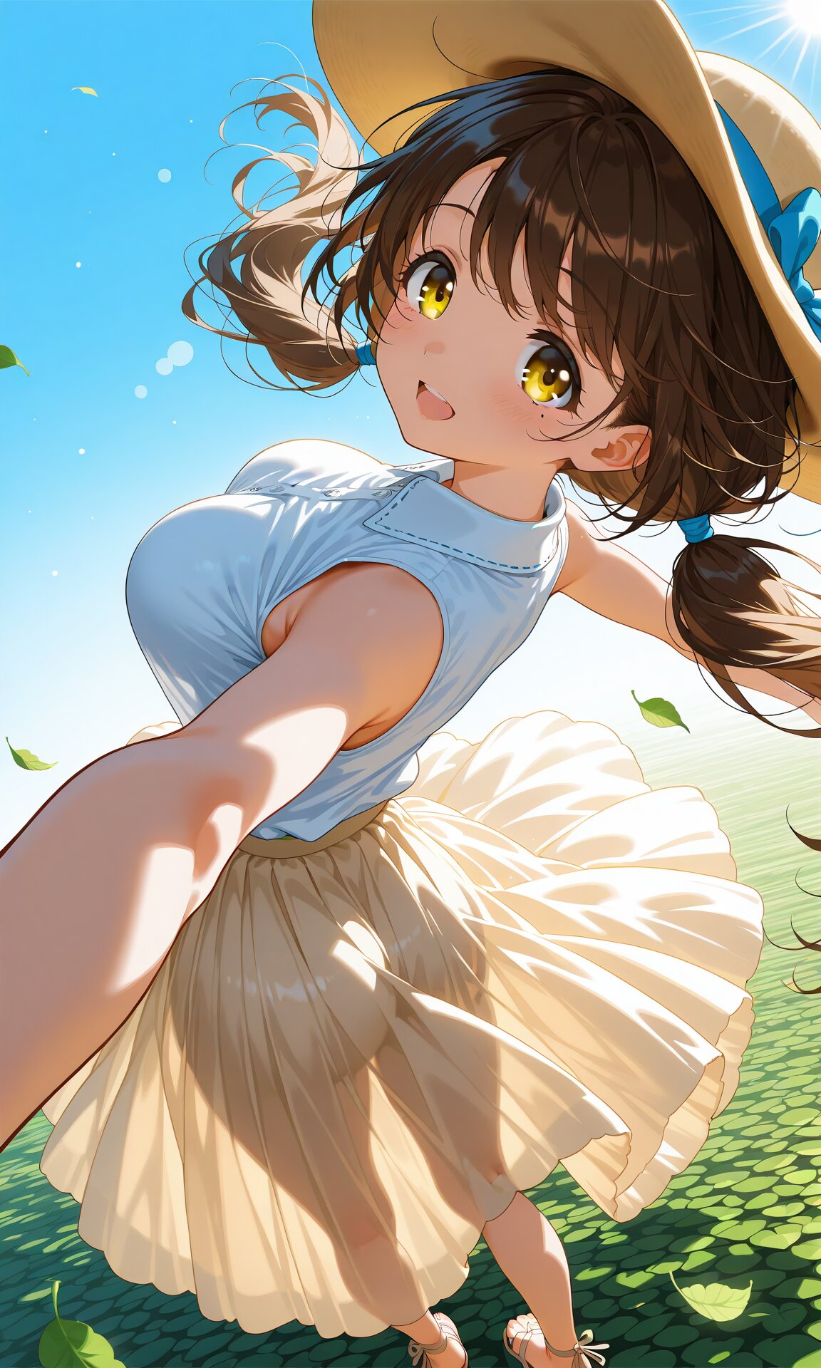 (blue sky, Expansive vista, Distant view, ) 1girl, cute, petite, dark brown hair, long hair, low twintails, floating hair, sun hat away, tareme:1.4, dark yellow eyes, mole left under eye, looking at viewer, smile, open mouth, large breasts, sleeveless pastel cobalt-blue white shirt, buttoned collar, untucked shirt, beige maxi skirt with see-through chiffon skirt layered, floating skirt, cross string sandals, outstretched arms. spread arms, from behind, from above, sunlight, wind, dancing green leaf, bokeh:1.4, Dreamy Blur, light particles, close up face, girl focus,