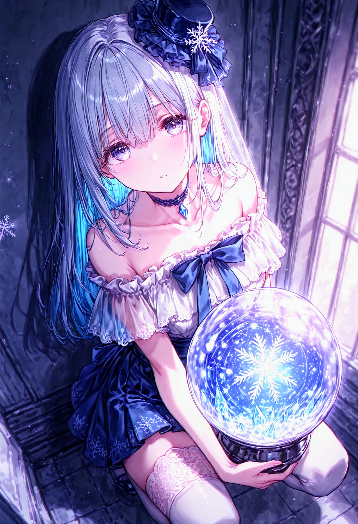 beautiful detailed background, best quality,,pale color, solo, (backlighting:1.1), depth of field, blurry background, (neon,neon lights:0.8), night,star light, (snowflakes:1.1),snow globe, Sparkling,orb,patterned , collarbone, parted lips,(Expressionless:0.9), big eyes,half-closed eyes, tareme, pale purple eyes, thighhighs, silver hair, (dark blue hair colored inner hair:0.8), long hair, eyebrows visible through hair, white off-shoulder and dark blue skirt, see-through veil, mini hat, blue strapping ribbon and bow, frills, strapping ribbon, choker, round lighting, temptation, Core shadow,, looking at viewer, squatting,leaning back against a wall, crystal, Irregularity of ice, specular, (reflection:0.6), magic,particle, neon,immersive, particle lighting,, (flash of light:1.1), shooting star, from above, <lora:see-through_paru:-2.0> <lora:darktheme_paru:-0.6> <lora:pale color_paru:-0.9> <lora:noline-16oa:-1.5> <lora:sdxl2-flat2-512b:-1.5> <lora:LECO_Solo:-1.0>