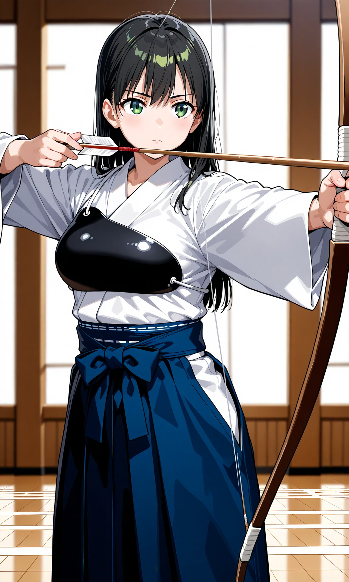 1girl, solo, black hair, long hair, straight hair, green eyes, medium breasts, smooth skin, kimono, white kimono, hakama, hakama skirt, muneate, kyuudou, archery dojo, standing, holding, yumi \(bow\), bow \(weapon\), holding bow \(weapon\), arrow (projectile), masterpiece, high score, great score, absurdres