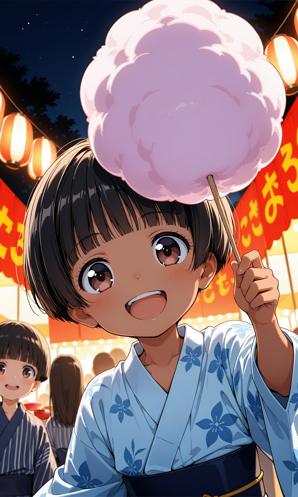 (score_9, score_8_up, score_7_up),rich contrast,outdoor,(festival, matsuri), solo focus,(large cotton-candy:1.35), upper body, BREAK 1girl,solo,cute,(female child,11 yo),black hair,(bowl cut),blunt bangs,flat chest,brown eyes, tan, smile,happy, large open mouth, kimono,yukata,