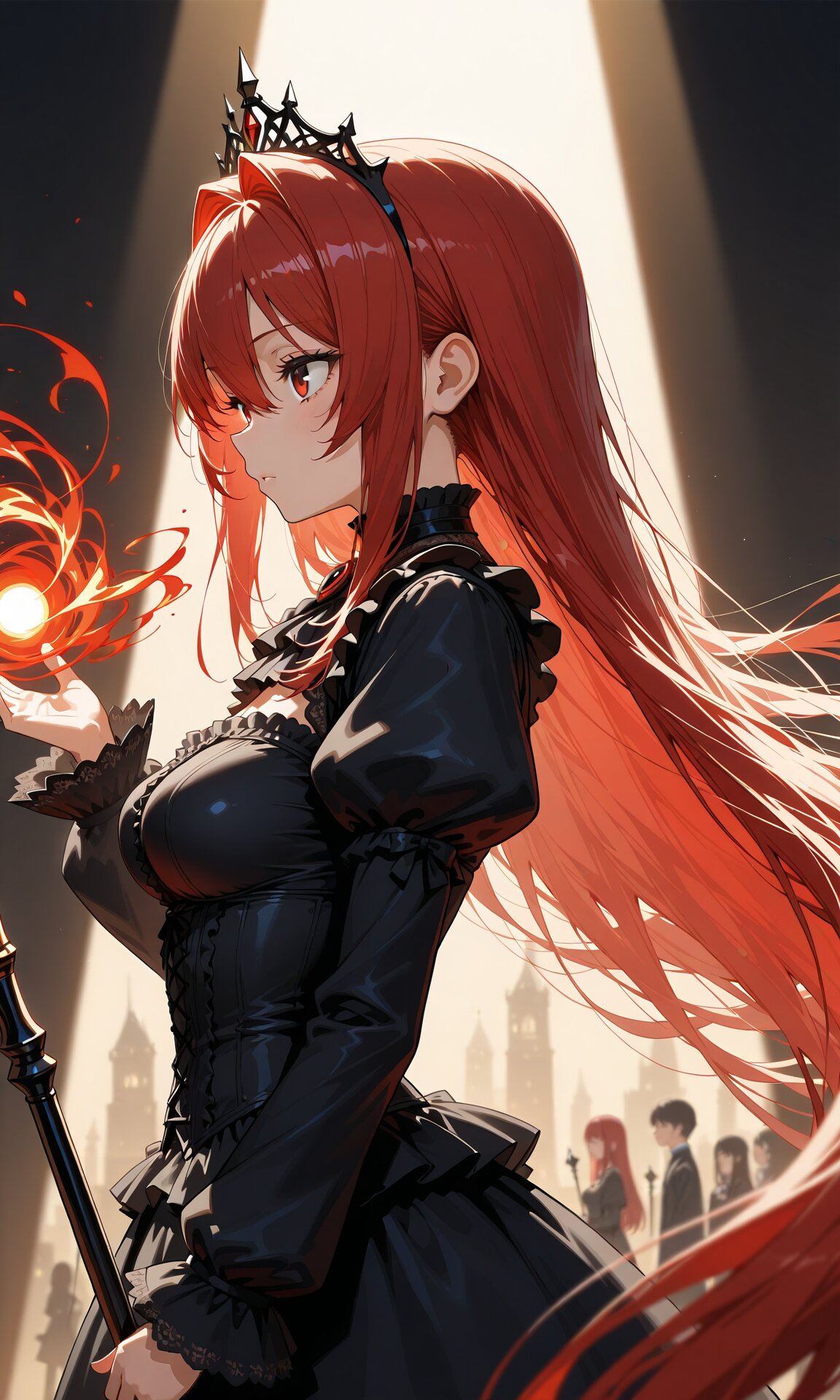 masterpiece, best quality, amazing quality, very aesthetic, high resolution, ultra-detailed, absurdres, newest, scenery, /*Prompt, BREAK,*/ depth of field, volumetric lighting, okashirastyle,8k,extremely detailed CG unity 8k wallpaper, (perfect face:1.2), 1lady,27yo,long_hair,brown_hair,red_eyes,hair_between_eyes,very_long_hair,brown_eyes,red_hair,floating_hair,hair_intakes,straight_hair,shiny_skin,medium_breasts,gothic lolita, goth fashion, black tiara, holding magic black staff, from side, (close up),