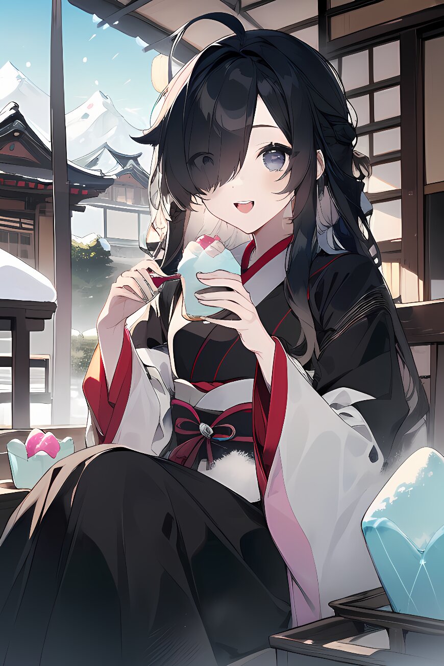 black hair, long hair, ahoge, (hair over one eye:1.2), black eyes, (+ +), smile, open mouth, cheerful,, sitting, Japanese house, ((eating kakigori)), cowboy shot,Art Style 2.0,pastellio, pastel, kawaii pastels