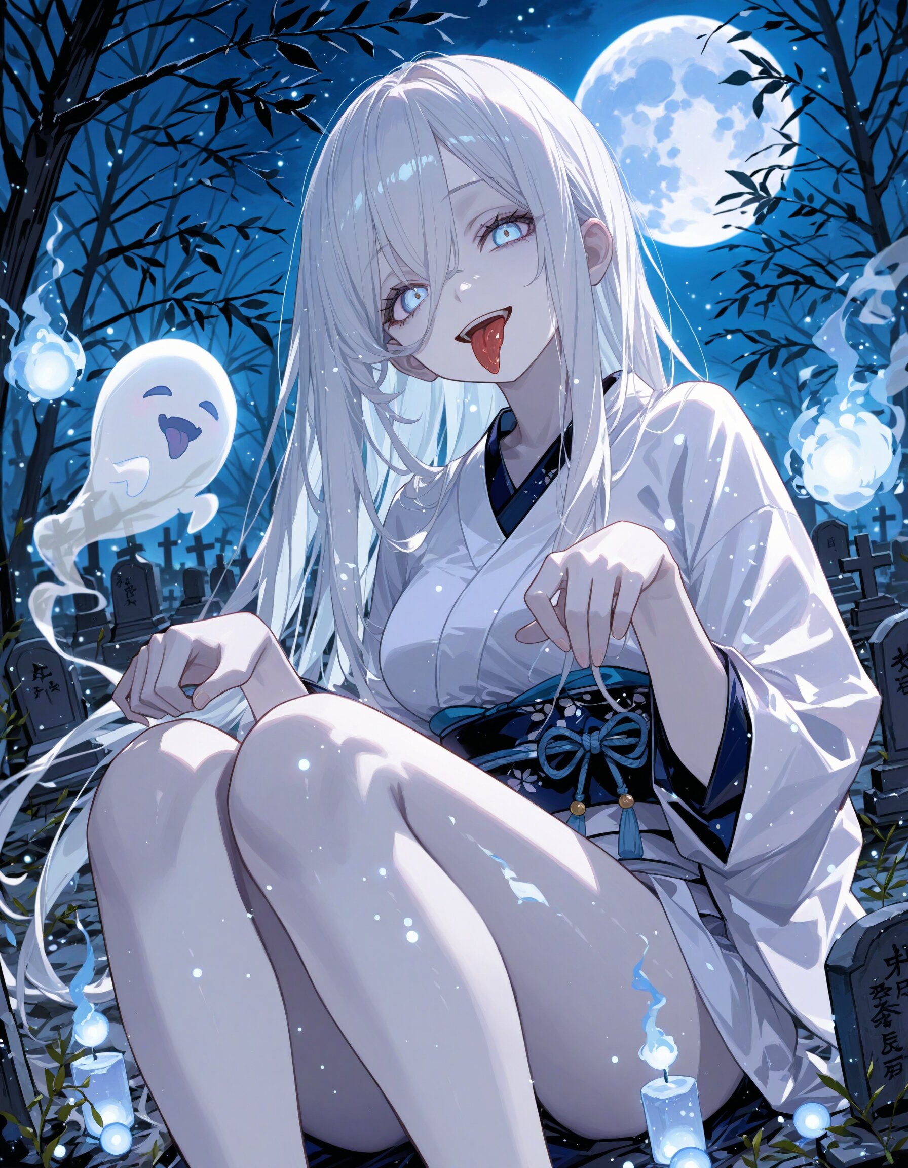 night,fullmoon,pale moon,japanese graveyard,japanese tombstone,dead trees,willow,1girl,solo,(japanese ghost lady),((floating in the air)),white hair,straight long hair,airly hair,happy smile,hungging out tongue,nolight eyes,light blue eyes,((pale skin)),medium breasts,simple white Kimono,knees up,ghost pose,(light blue fireballs around girl),((masterpiece,best quality,extremely detailed,absurdres)),