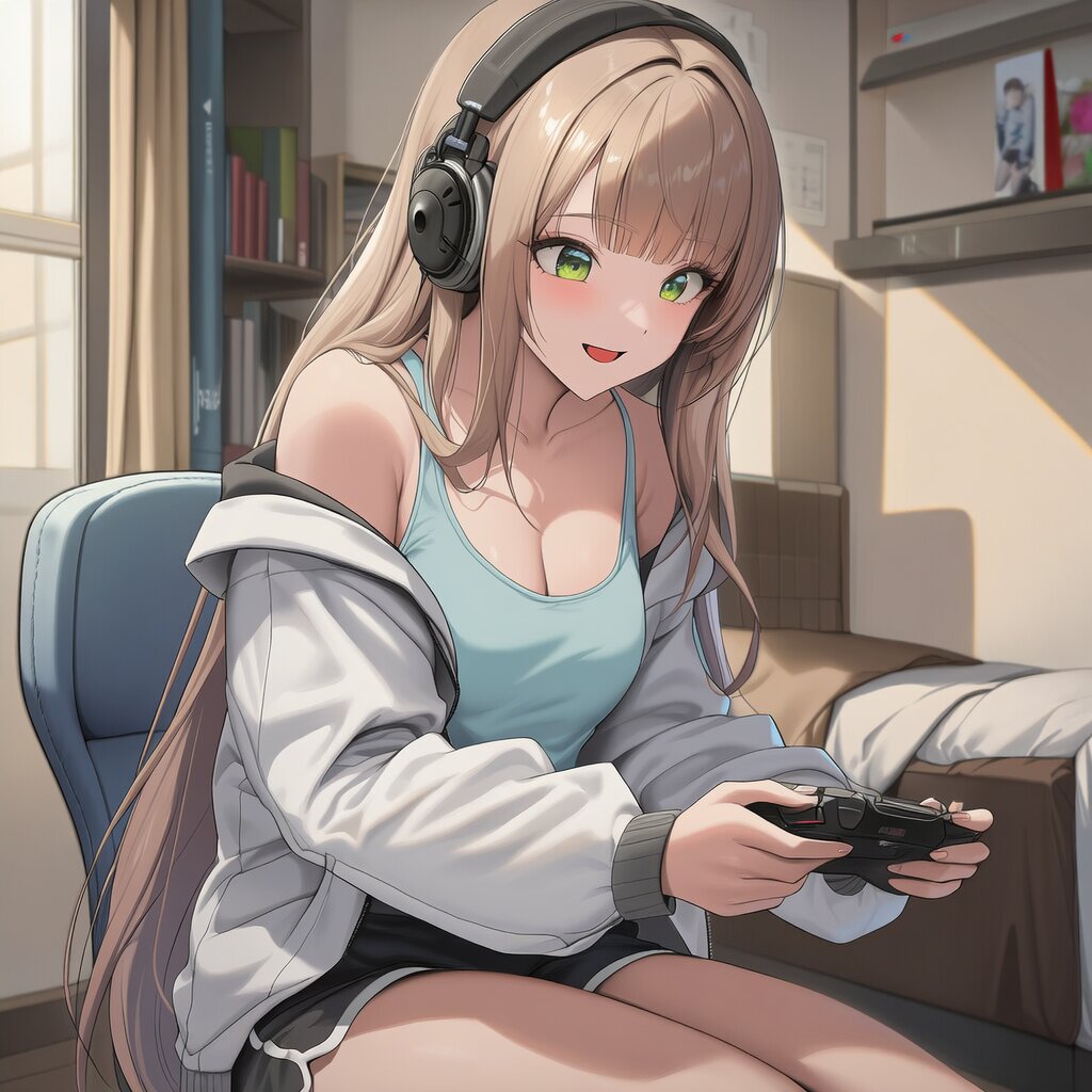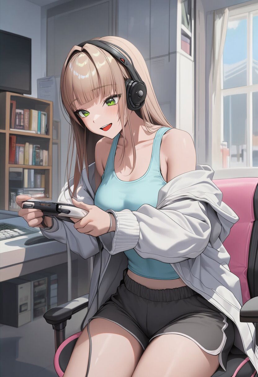 {{{highly detailed}}}, {{official style}}, {{game cg}}, {{intricate}}, {{goddess of victory: nikke}}, style of ai-generated, 1girl, solo, green eyes, long hair, blunt bangs, straight hair, light brown hair, medium breasts, light smile, light blue tank top, white jacket, black shorts, cowboy shot, sitting, sit on a chair, indoor, bookshelf, bed, livestream, streamers, leaning forward, laughing, {{headphone}}, {{{playing video game}}}, wearing headset, streaming, {{{masterpiece}}}, {{{best quality}}}, {{{very aesthetic}}}, {{{ultra-detailed}}}, {illustration}, {{{extremely detailed}}}, {{{an extremely delicate and beautiful}}}