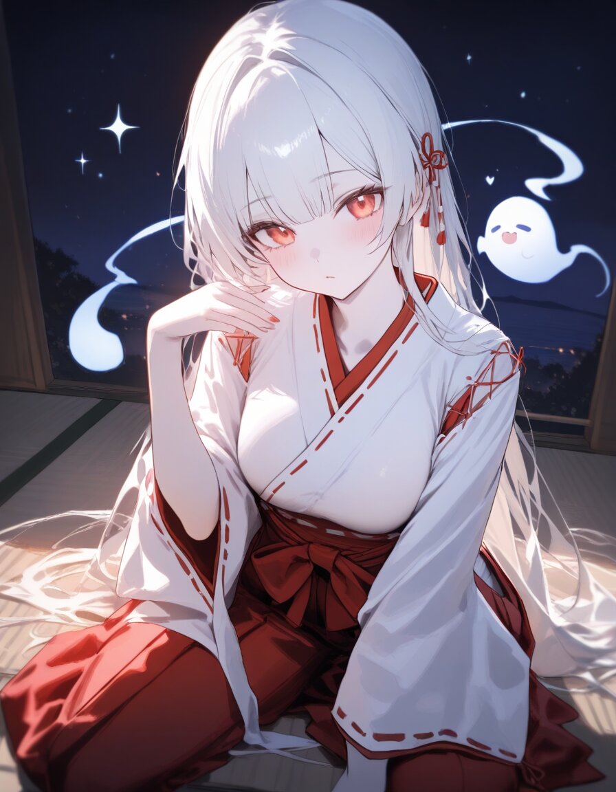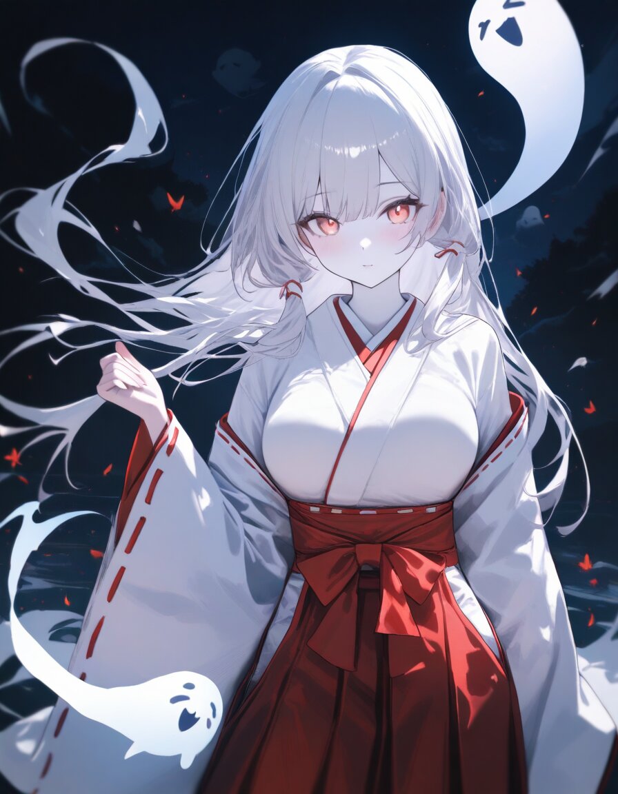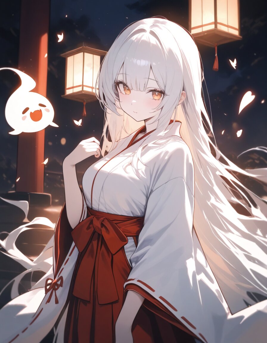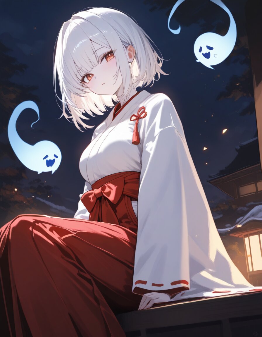 night, 1girl, solo, pale skin, glow skin, white hair, miko, japanese clothes, kimono, white kimono, red hakama, hakama skirt, cute ghost, looking at viewer, masterpiece, great score, high score, absurdres