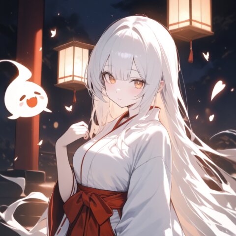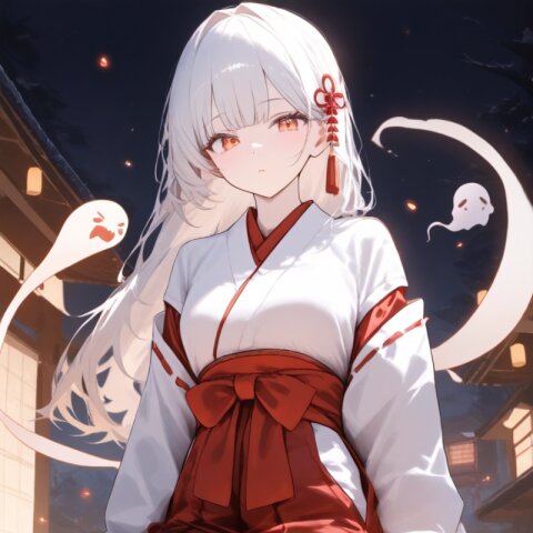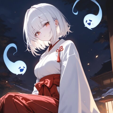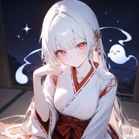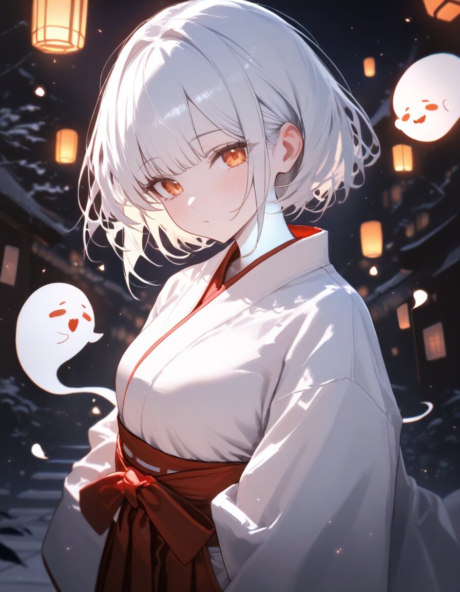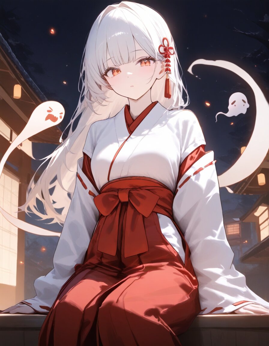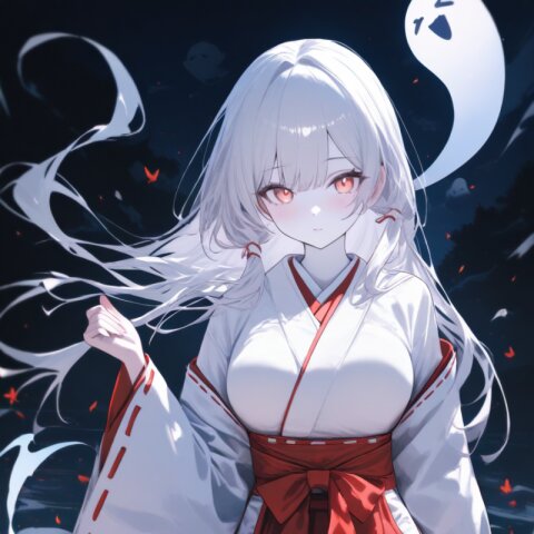 night, 1girl, solo, pale skin, glow skin, white hair, miko, japanese clothes, kimono, white kimono, red hakama, hakama skirt, cute ghost, looking at viewer, masterpiece, great score, high score, absurdres