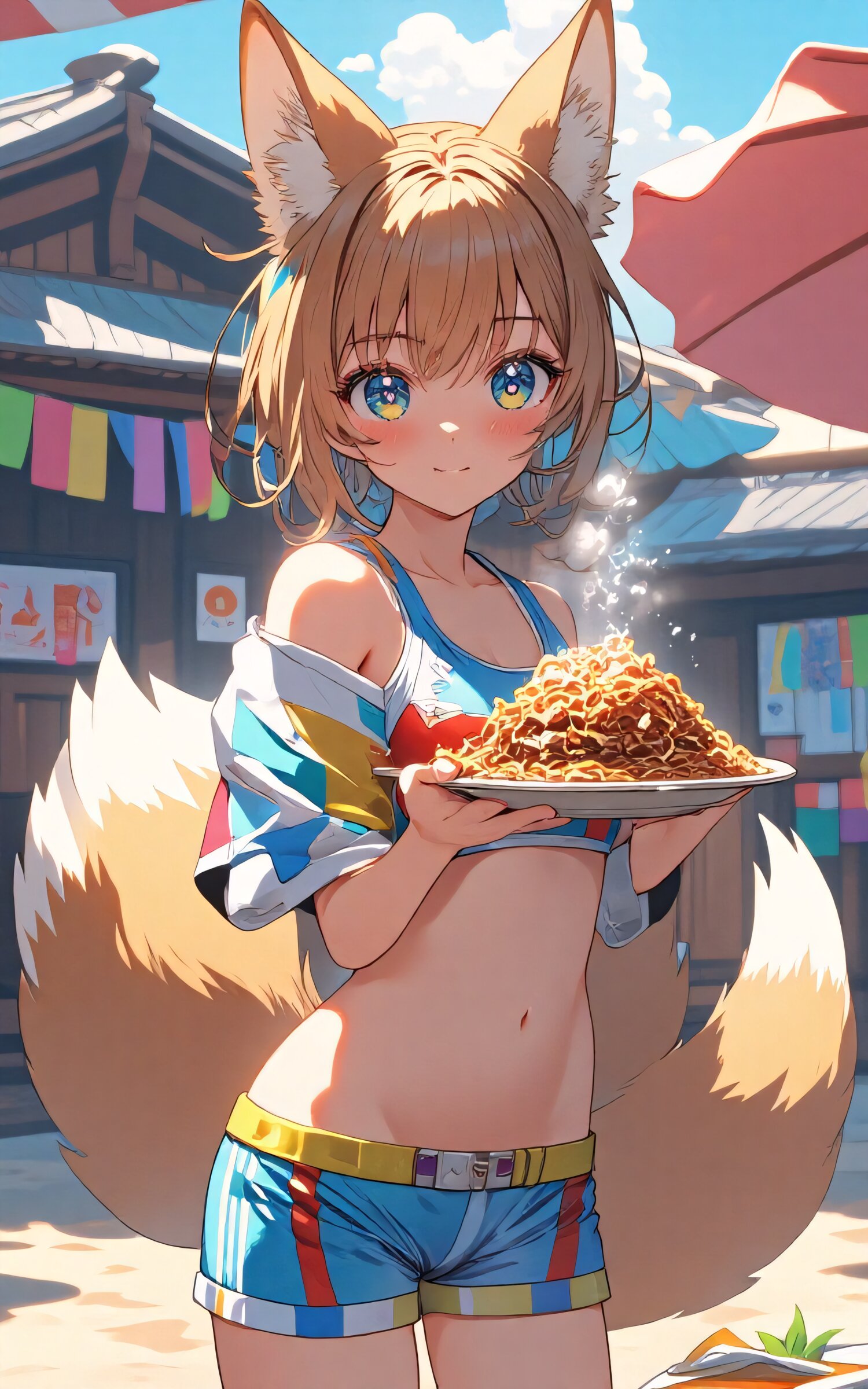 anime style, full-body, fox-eared girl, light brown hair flowing gently, deep expressive eyes with double eyelids and long delicate eyelashes, fluffy fox tail swaying behind her, wearing a sporty swimsuit top and half pants with a beach towel draped over her shoulder, cheerful expression, holding a plate of freshly cooked yakisoba with steam rising, standing in front of a traditional Japanese beach hut (umi-no-ie) with colorful banners and parasols, bright summer sunlight and blue sky, soft ambient lighting enhancing the vibrant and playful atmosphere, cinematic composition, visually captivating aesthetic
