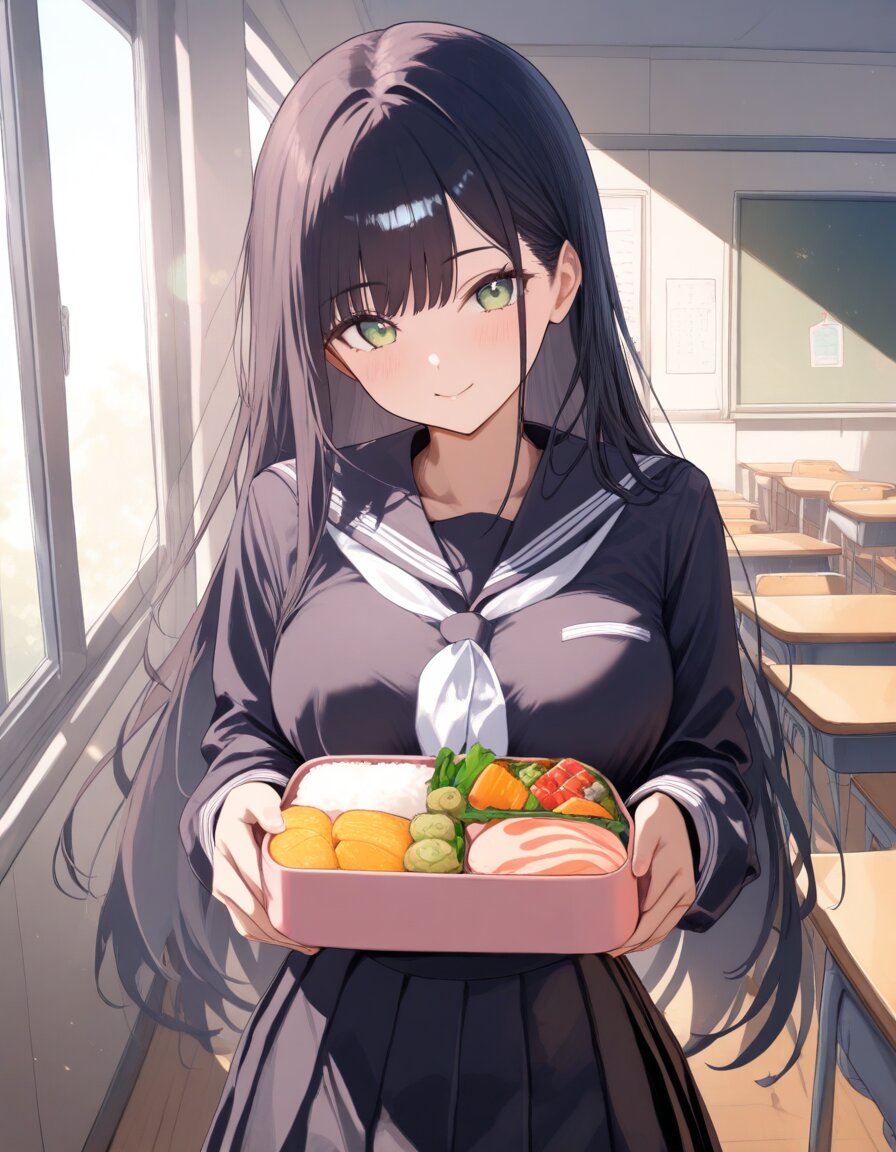 classroom, 1girl, solo, black hair, long hair, straight hair, green eyes, medium breasts, smooth skin, happy, black serafuku, white neckerchief, black pleated skirt, bento, holding bento, looking at viewer, masterpiece, great score, high score, absurdres