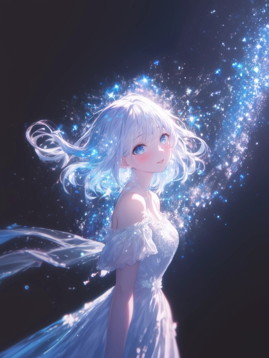 anime style, upper body, Absolutely beautiful girl, short silver hair that glows light blue inside, blue eyes, white wedding dress woven with gorgeous light, Romantic, heroine light.