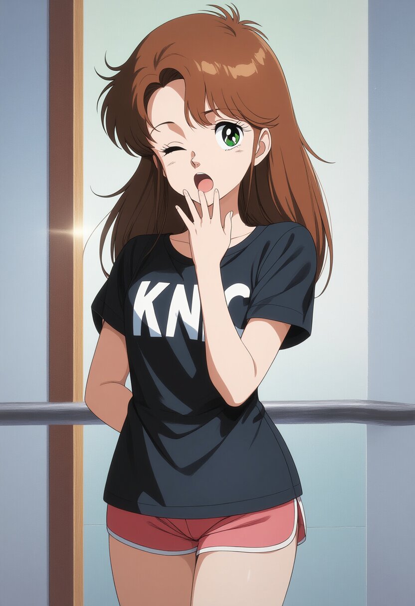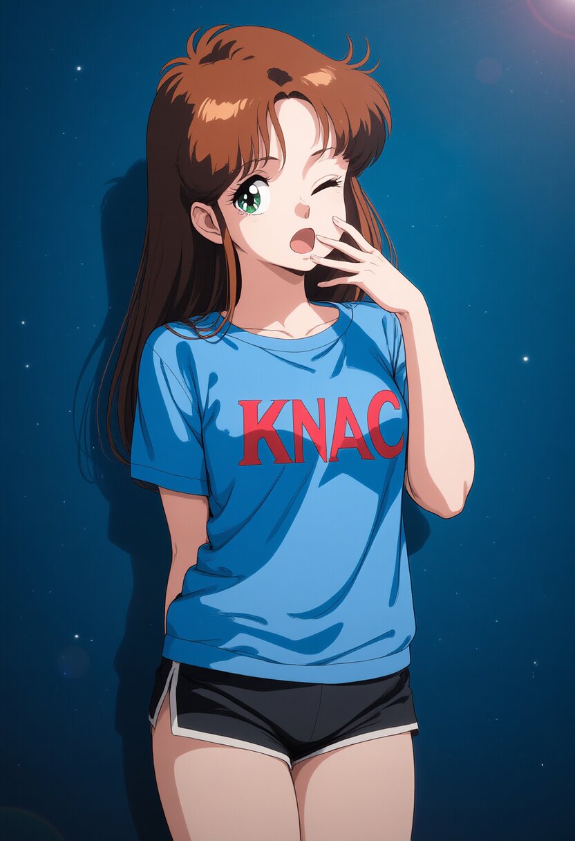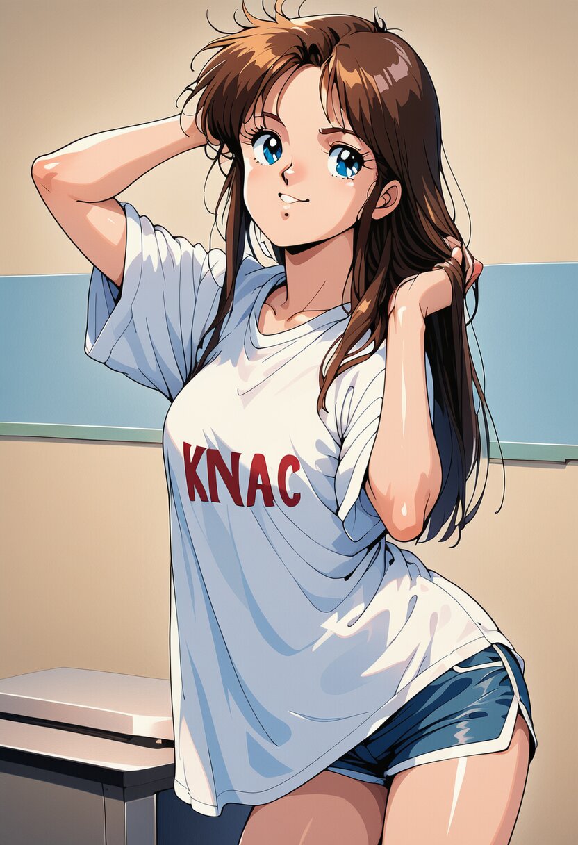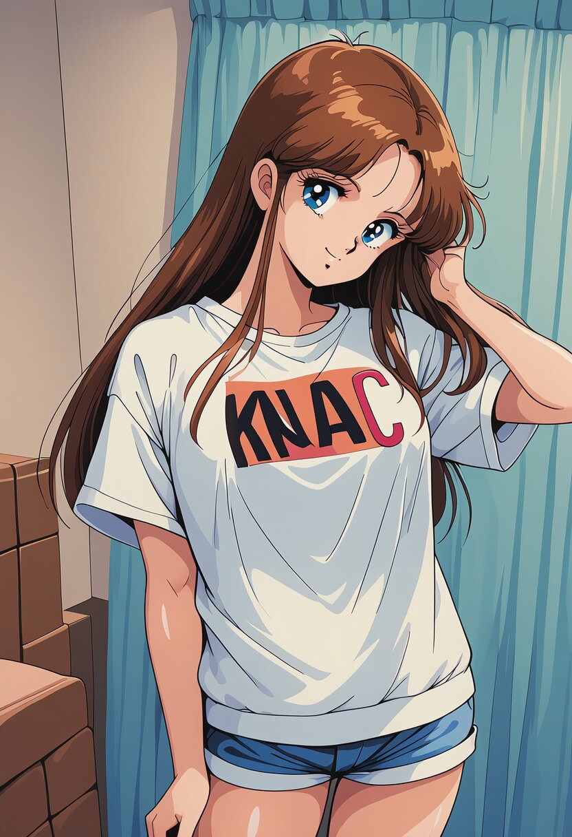 {{{1girl}}},shiny skin, detailed face, Japanese idol, beautiful face,ideal ratio body,18years old high school student,slender body,{{retro art style,1980s (style),taste of japanese anime in 1988,game cg,illustration,madeon}},ai-generated,32K,medium breasts,medium chest,{{baggy t-shirt,text on t-shirt:KNAC Pure rock,shorts}},{{{cute eyes,beautiful detailed eyes,blue eyes}}},{{{{{{brown hair,long hair,center parted bangs,straight hair,sidelocks}}}}},{{smile}},{{hand in own hair,simply background}},amazing quality,absurdres,rating:general best quality, very aesthetic,, location, very aesthetic, masterpiece, no text