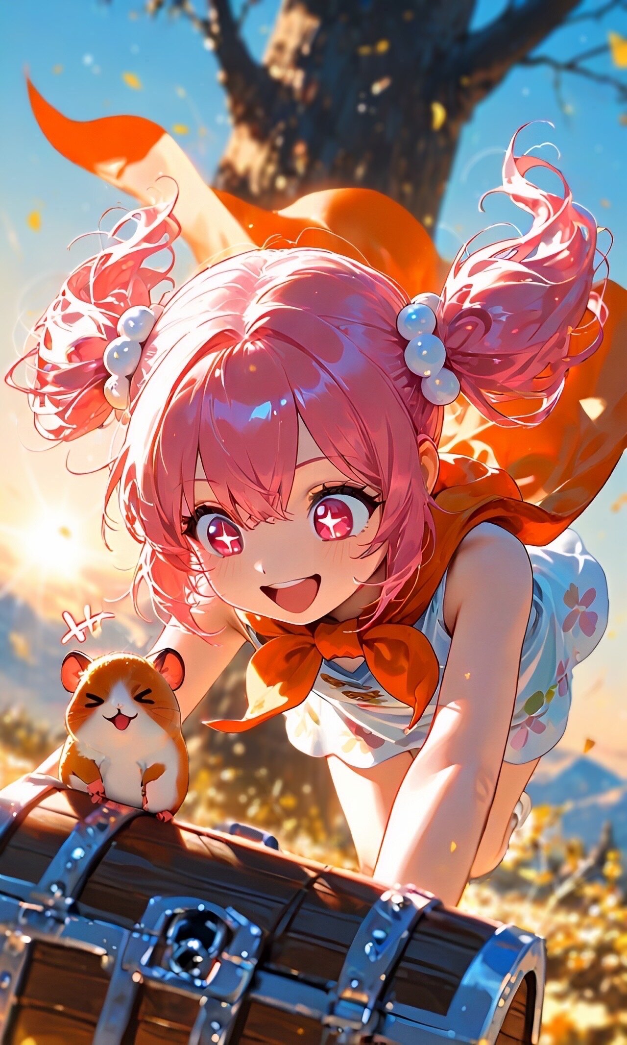 (masterpiece:1.2), best quality, ultra-detailed, (sunli ght: 1.1), kawaii, big beautiful eyes, detailed irises, s oft catchlights, anime-style expression, child face, 10 year old, very aesthetic, twilight, clear sky, Flowe ring meadows, distant mountains, under the tree, s olo, diagonal angle, dynamic pose, (a sense of mov ement), looking down on a treasure chest:1.1, pink hair, twintails, pink eyes, open mouth, cheerful smil e, +_+, notice lines, sleeveless halter neck dress, or ange cape, BREAK, BREAK (hamster:1.1), > <, ha mster on shoulder