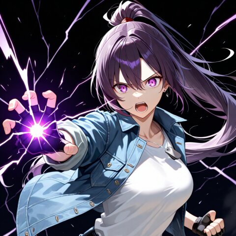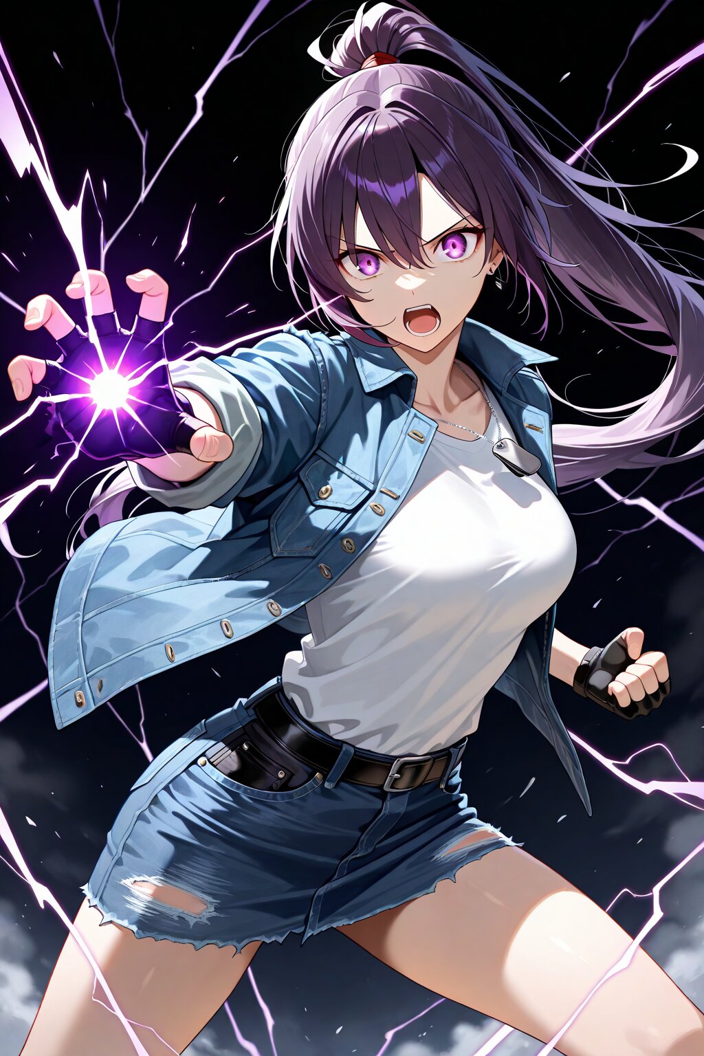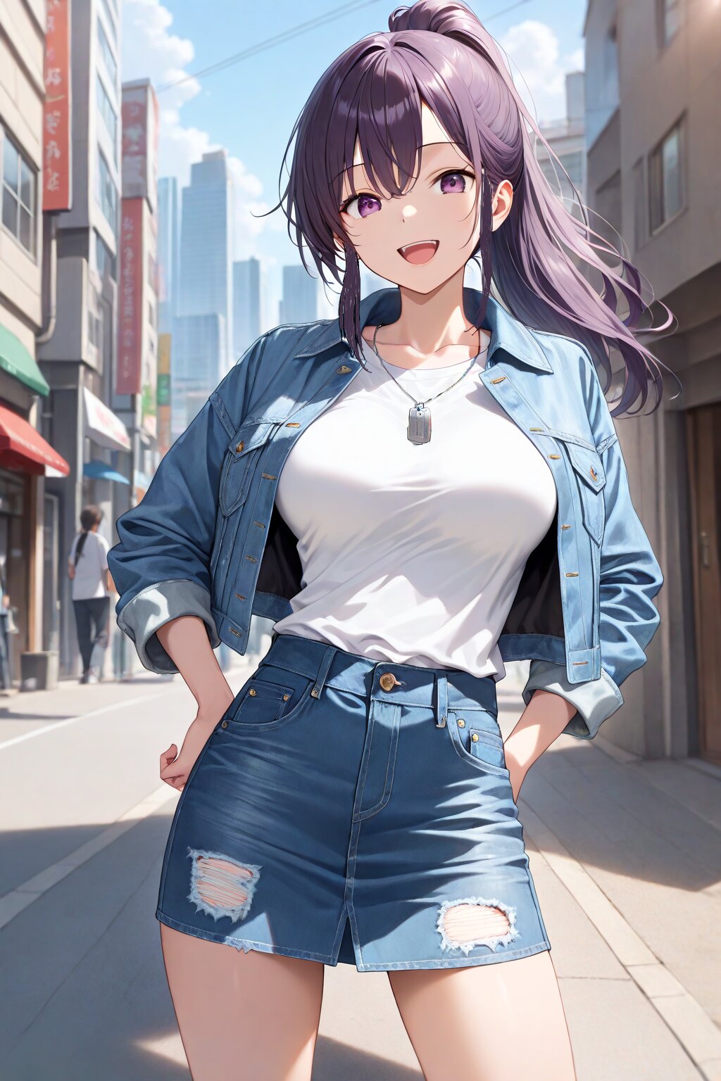 masterpiece, best quality, amazing quality, cowboy shot, detailed face, 1girl, dark purple hair, long ponytail, hair behind back, purple eyes, medium breasts, denim jacket, denim skirt, white shirt, bare legs, open eyes, looking at viewer, smile, open mouth, standing, silver neckless, dogtag, legs apart BREAK outdoor, city, day, from forward