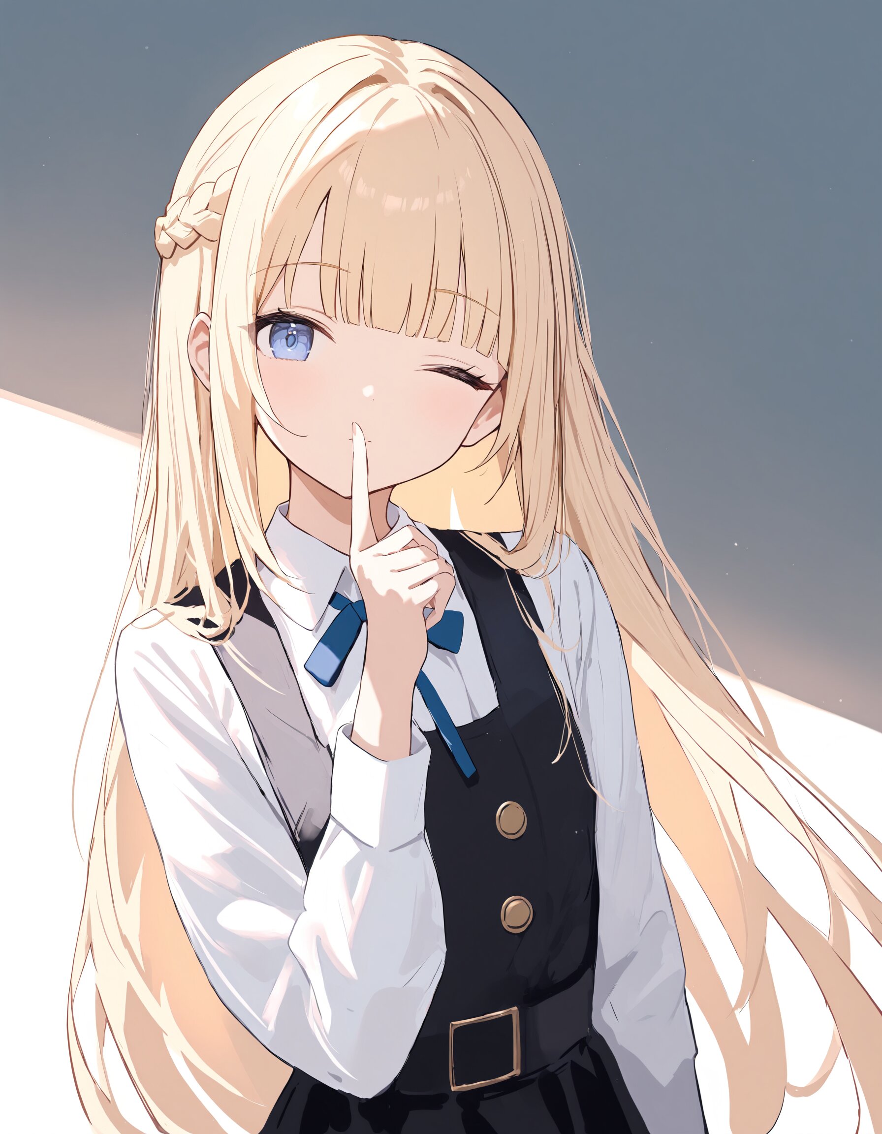 solo, 1girl, (13yo:1.1), very long hair, blonde hair, french braid, straight hair, (hime cut:1.1), blunt bangs, blue eyes, black Pinafore dress, neck ribbon, white blouse, 4gold buttons, finger to mouth, one eye closed, masterpiece, great score, high score, absurdres