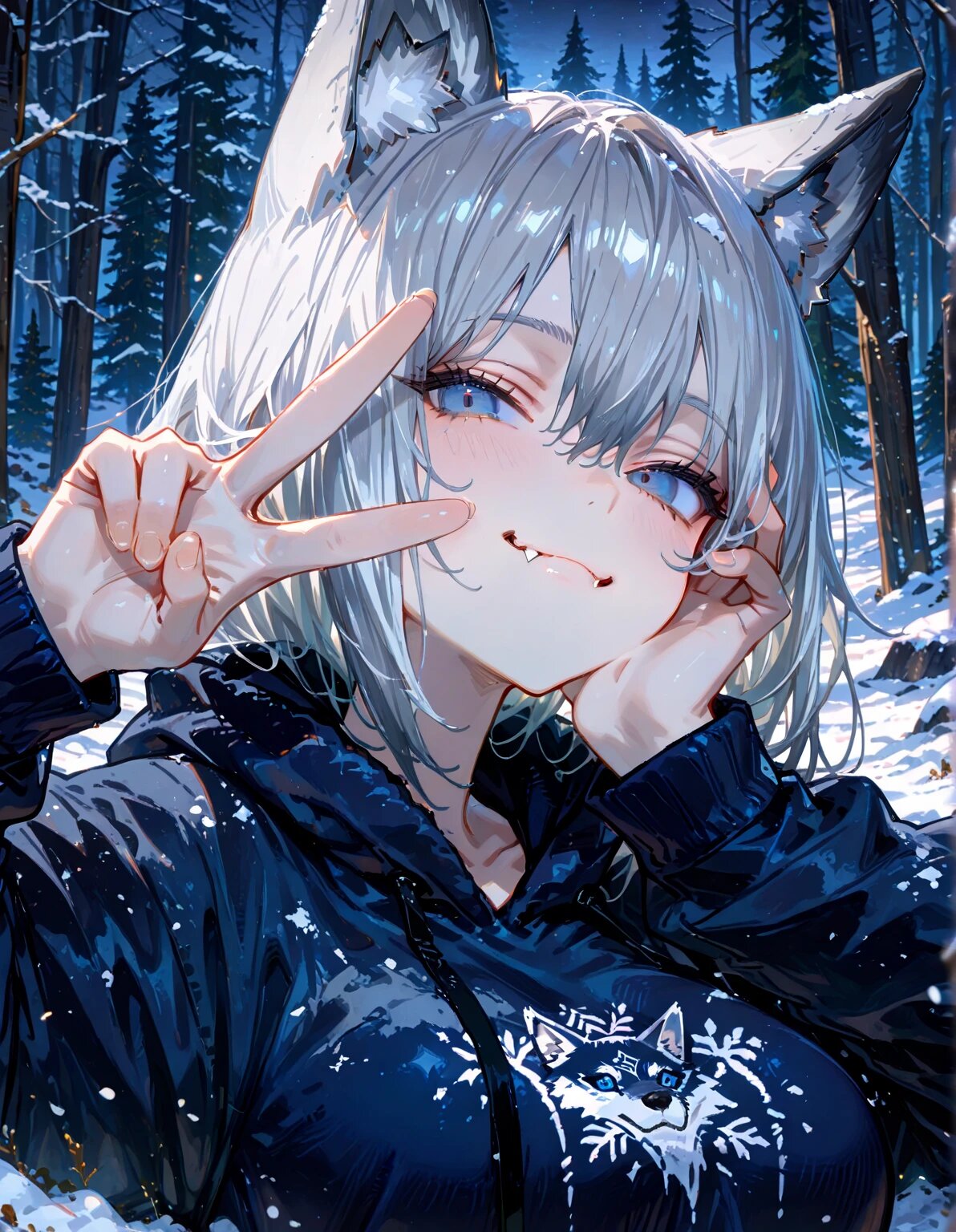 snowy forest,snow covered trees,night,1girl,solo,portrait,(wolf lady),gray hair,short hair,gentle smile,fang,blue eyes,dark blue hoodie,medium breasts,peace sign pose,hands near own cheek,((masterpiece, best quality, extremely detailed, absurdres)),