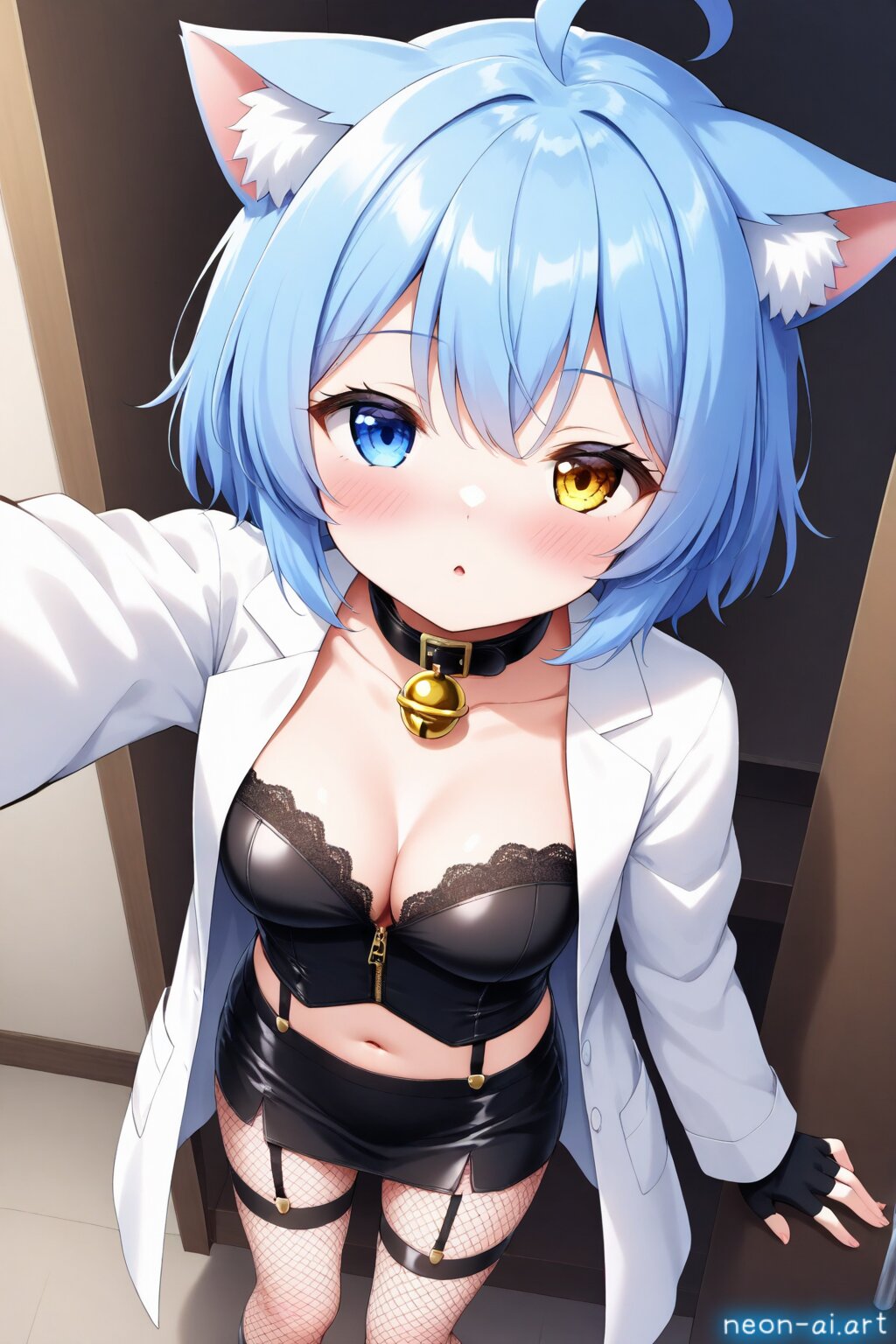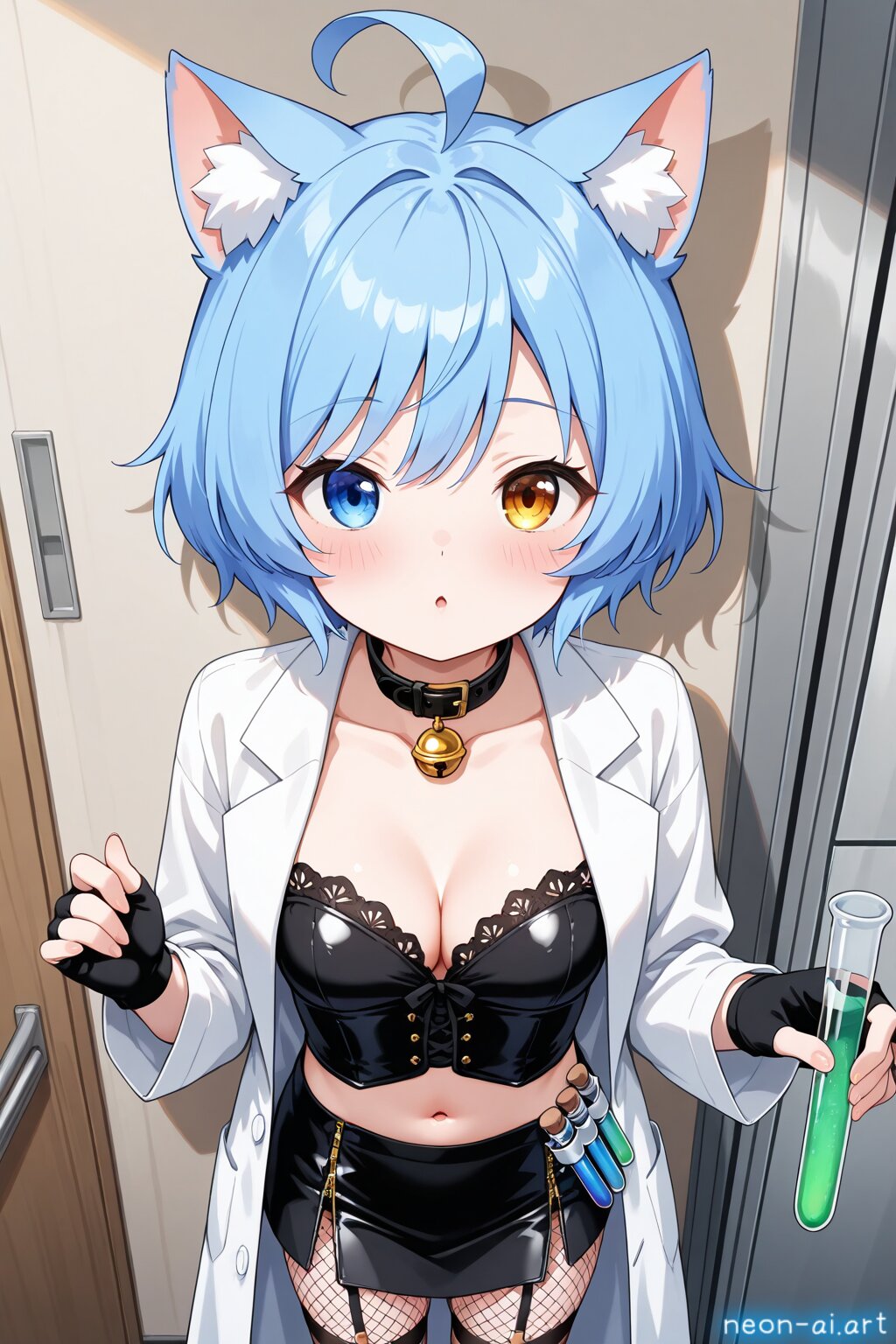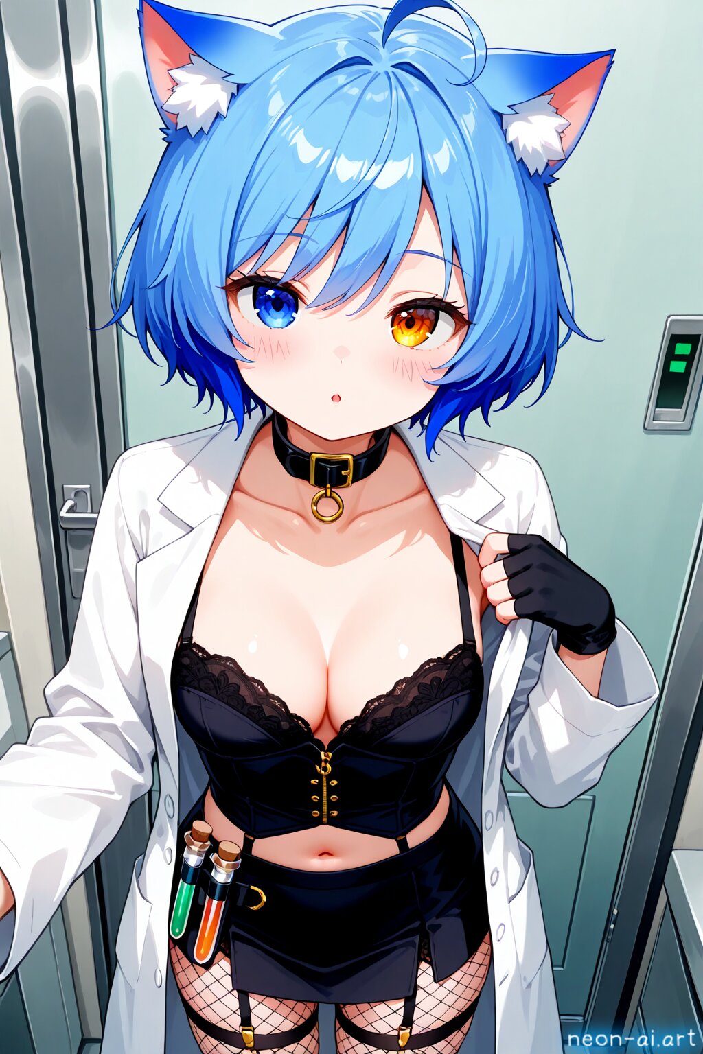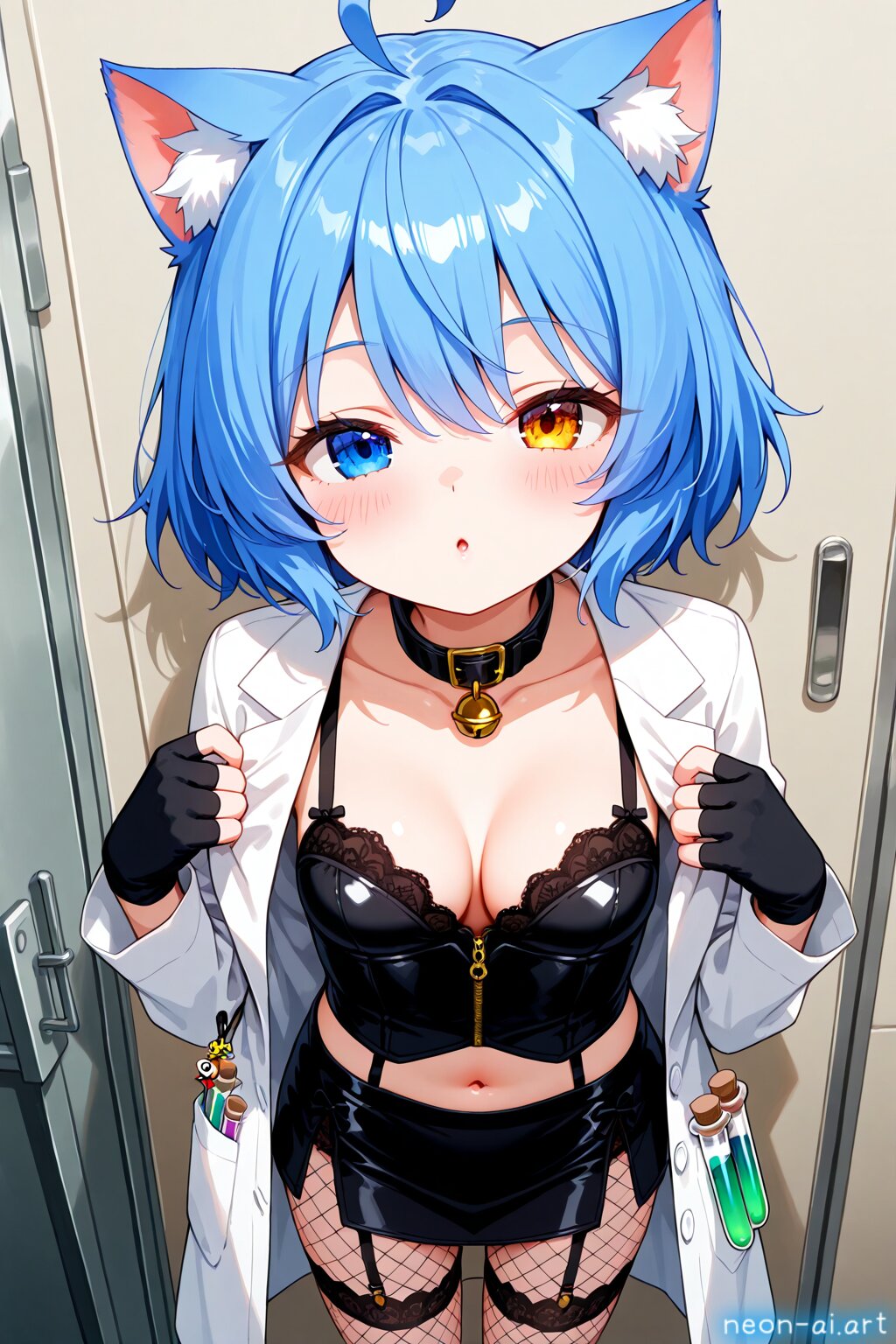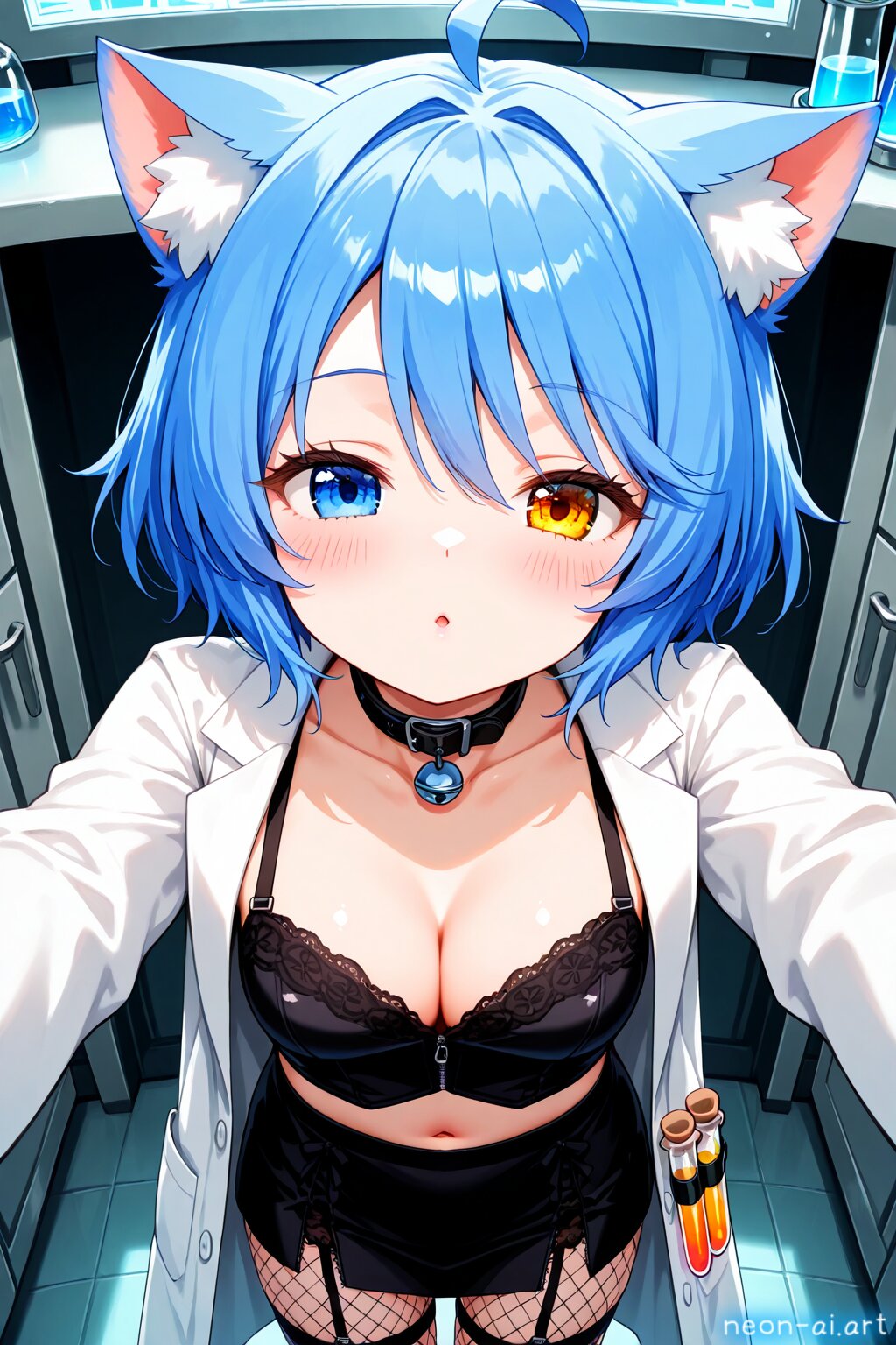Sultry Scientist Experiment, This costume combines quirky charm of mad scientist with seductive allure of (lingerie), Start with form-fitting bustier or corset in metallic or black color, featuring lace-up details or zipper accents for futuristic touch, Pair it with matching panties or high-waisted skirt in coordinating color, adorned with faux leather or mesh panels for laboratory-inspired look, Add thigh-high stockings or fishnet tights with garter straps to complete lingerie ensemble, BREAK Accessorize with fingerless gloves, lab coat or jacket with dramatic lapels or asymmetrical closures, Carry beaker or test tube prop filled with colorful liquid for extra touch of mad scientist flair, With this sultry costume, you'll be ready to conduct some steamy experiments in the laboratory of love, BREAK from above, half-closed eyes, blush, bashful, embarrassed, incoming kiss, navel, indoor, laboratory,