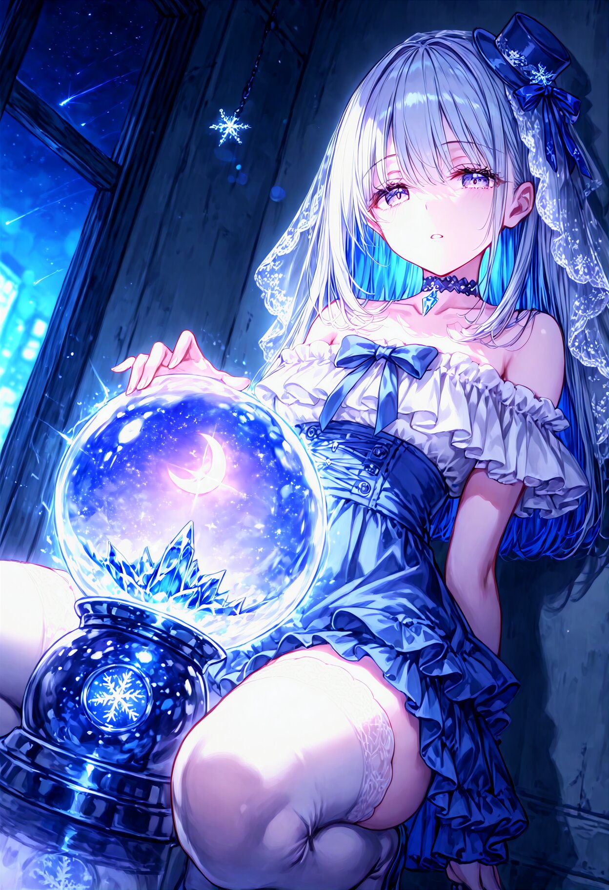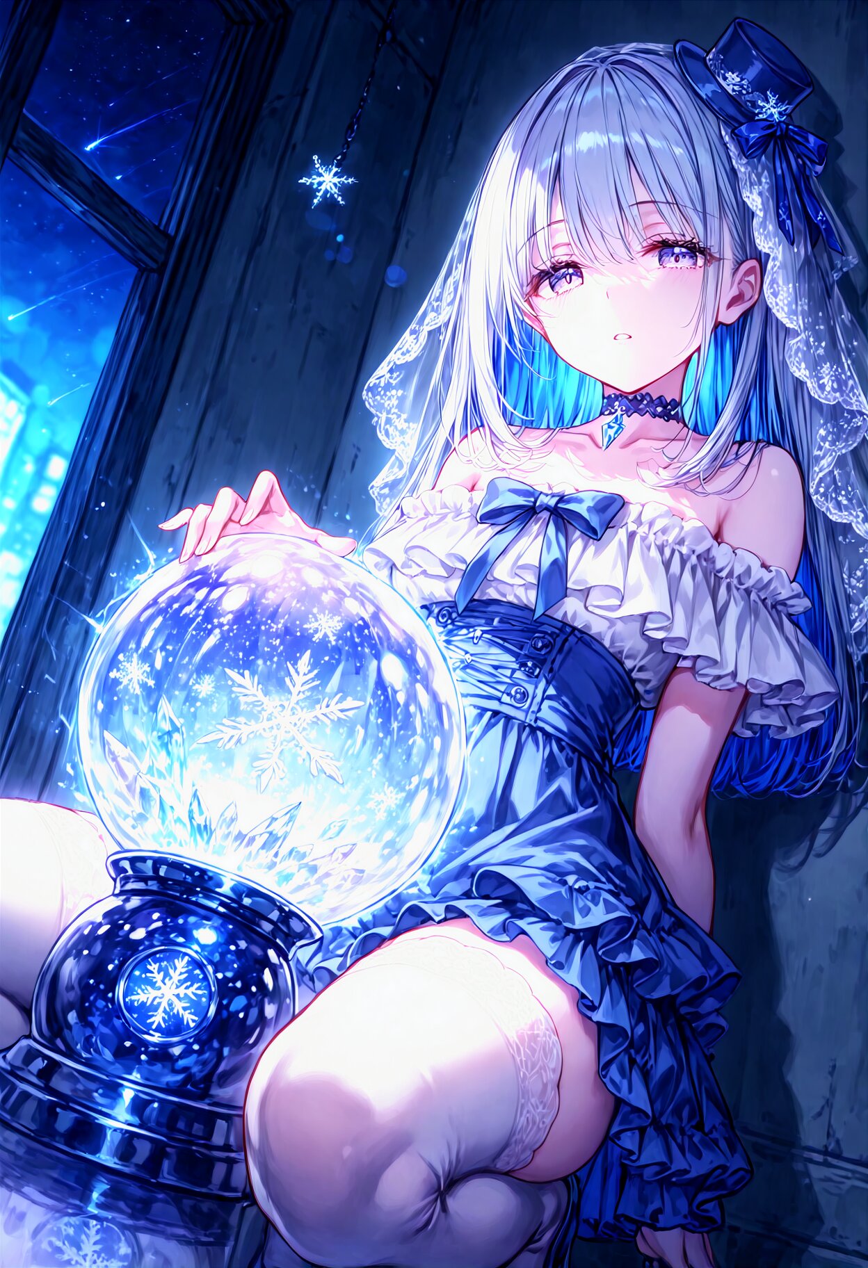 beautiful detailed background, best quality,,pale color, (solo:1.1), (backlighting:1.1), depth of field, blurry background, neon,neon lights, night,star light, (snowflakes:1.1),snow globe, Sparkling,orb,patterned , collarbone, parted lips,(Expressionless:0.9), big eyes,half-closed eyes, tareme, pale purple eyes, thighhighs, silver hair, (dark blue hair colored inner hair:0.8), long hair, eyebrows visible through hair, white off-shoulder and dark blue skirt, see-through veil, one mini hat, blue strapping ribbon and bow, frills, strapping ribbon, choker, round lighting, temptation, Core shadow,, looking at viewer, squatting,leaning back against a wall, crystal, Irregularity of ice, specular, (reflection:0.6), magic,particle, neon,immersive, bokeh,, (flash of light:1.1), shooting star, intense angle, <lora:see-through_paru:-2.0> <lora:darktheme_paru:-0.6> <lora:pale color_paru:-0.9> <lora:noline-16oa:-1.4> <lora:sdxl2-flat2-512b:-1.2> <lora:LECO_Solo:-1.8> <lora:LECO_BadHands:-2.5>