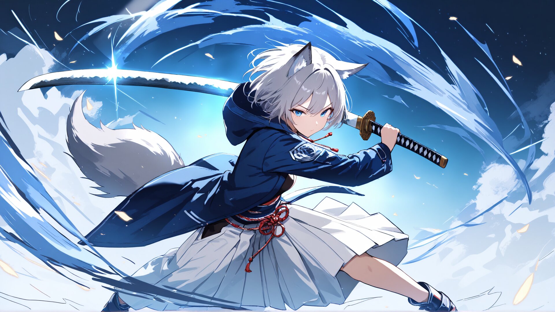 animal ears, wolf ears, wolf tail, short hair, gray hair, blue eyes, floating hair, deep blue coat, hooded coat, hooded down, hakama skirt, white hakama, small breasts, full body, holding, ootachi, holding sword, fighting stance, masterpiece, great score, high score, absurdres