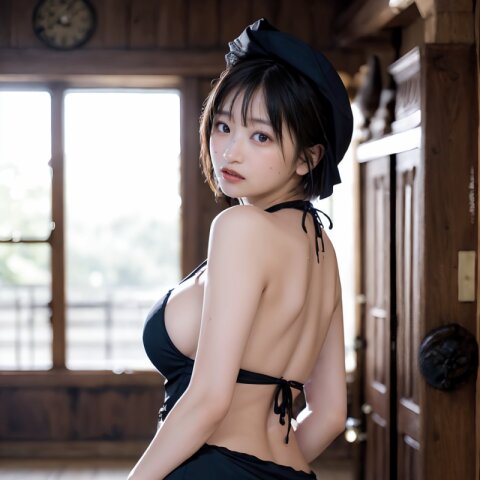 (from back: 1.2), (8k, best quality, masterpiece:1), (realistic, photo-realistic:1.4), HDR, (incredibly absurdres:1.2), 1girl, 20 years old, perfect anatomy, slender, (slender, huge breast, big ass: 1.8), beautiful detailed face, short hair, (cowboy shot: 1.6), perfect skin, detailed skin texture, looking aside, (Gothic Maid: 1.6), (standing and posing, leaning forward: 1.6), in the poolside, <lora:yui_v01:0.8>