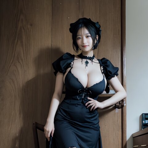 (from side: 1.2), (8k, best quality, masterpiece:1), (realistic, photo-realistic:1.4), HDR, (incredibly absurdres:1.2), 1girl, 20 years old, perfect anatomy, slender, (slender, huge breast: 1.8), beautiful detailed face, short hair, (full body: 1.6), perfect skin, detailed skin texture, looking aside, (Gothic Maid: 1.6), (standing and posing, leg on chair: 1.6), in the poolside, <lora:yui_v01:0.8>