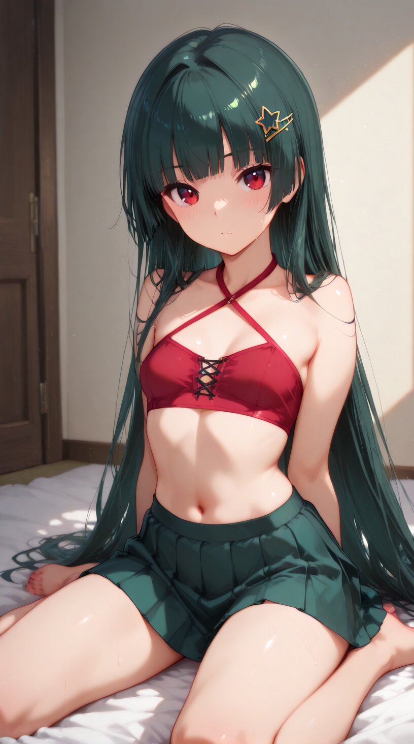 masterpiece,best quality,ultra-detailed,high resolution,super detailed skin,perfect anatomy,beautiful detailed eyes, girl, dark green hair, long hair, hime cut, red eyes, small breasts, glittery red halter top, green pleated mini skirt, star-shaped hairpins, barefoot, wariza