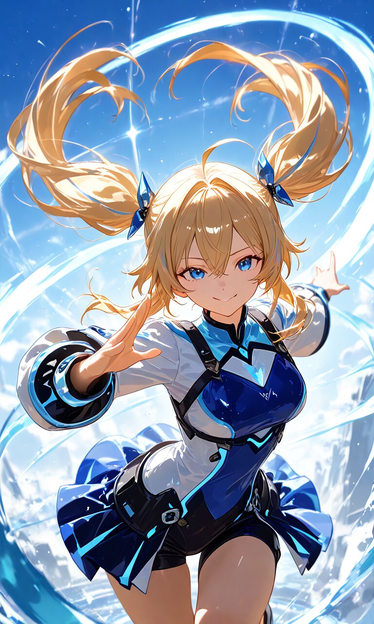 1 girl, twintails, long hair, blue eyes, blonde hair, blue streaked hair, ahoge,bangs between eyes, smile, (Jumping), cowboy shot