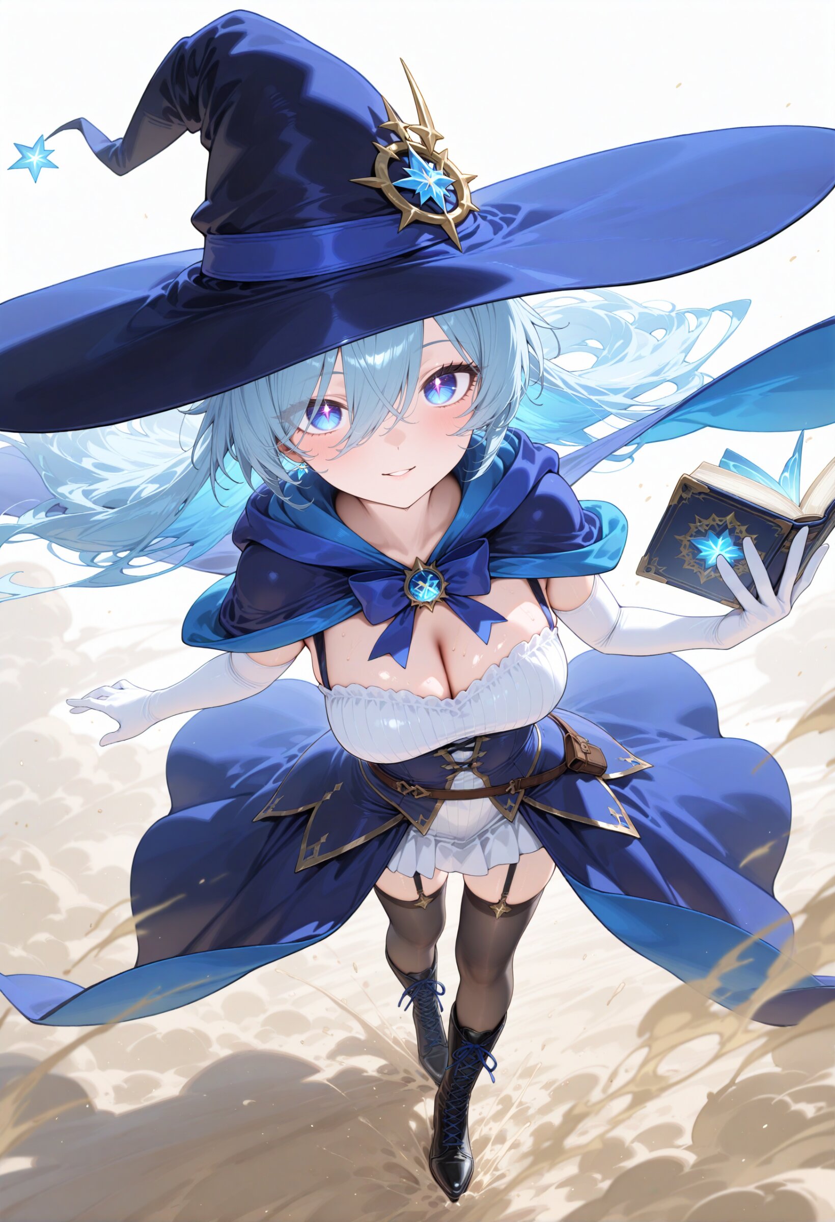 close to viewer (from above,looking up:1.2) looking at viewer, 1girl, witch girl, blue eyes, beautiful iridescence eyes, beautiful detailed eyes, beautiful light blue hair, long bangs, long disheveled beautiful hair, first-rate female bodies, perfect body, beautiful breasts, framed breasts, cool face, (Beautiful Lips:0.7),, (stylish beautiful witch dress:1.2), white elbow gloves, (cute blue and dark blue witch girl costume:0.9), (white blouse:1.3), bow tie, witch long skirt (overskirt:1.1) aqua cape, (blue galaxy witch hat:1.1), lace-up boots on feet, stockings and suspenders,, mysterious face, contempt cast a magic, wind magic, sandstorm, floating hair, magic book, , super fine concept art, hard surface, 8K, unreal engine, masterpiece, best quality, amazing quality, very aesthetic, absurdres you can add scenery, (volumetric lighting), To make the background more distinctive. professional art lots of details, , overexposure, shiny-glistening, (watercolor style:0.0), (pastel color style:1.0) <lora:noline (1):-0.5> <lora:sdxl2-flat2-512b:-0.5> <lora:facelightup_xl_v10:0.5>