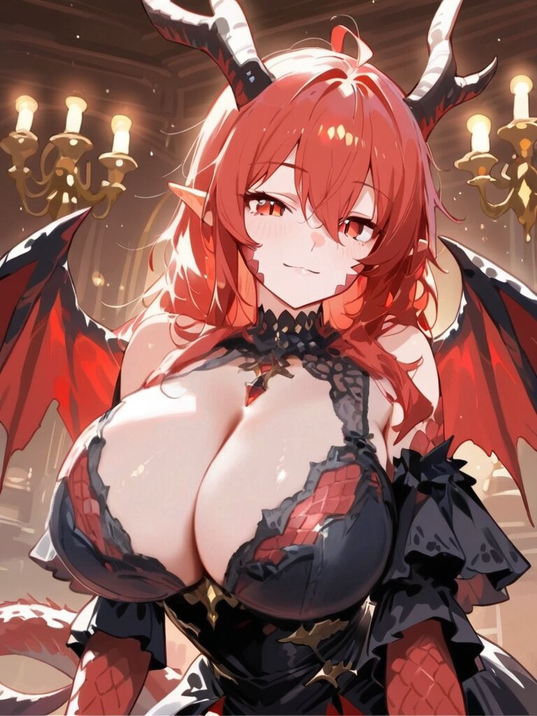 monster_girl, detailed skin, red hair, messy hair, detailed hair, red eyes, snake pupils, detailed eyes, tareme, light smile, dragon horns, huge breasts, Cleavage, red jewels, pointy ears, seductive scales, Gothic style dress, scales decoration, dragon wings, scales tail, indoors, chandelier, *ベースモデルにHassaku XLを採用しています。制作者の加筆修正が多分に含まれているので、プロンプト通りに入力しても出力されない可能性が高いです。