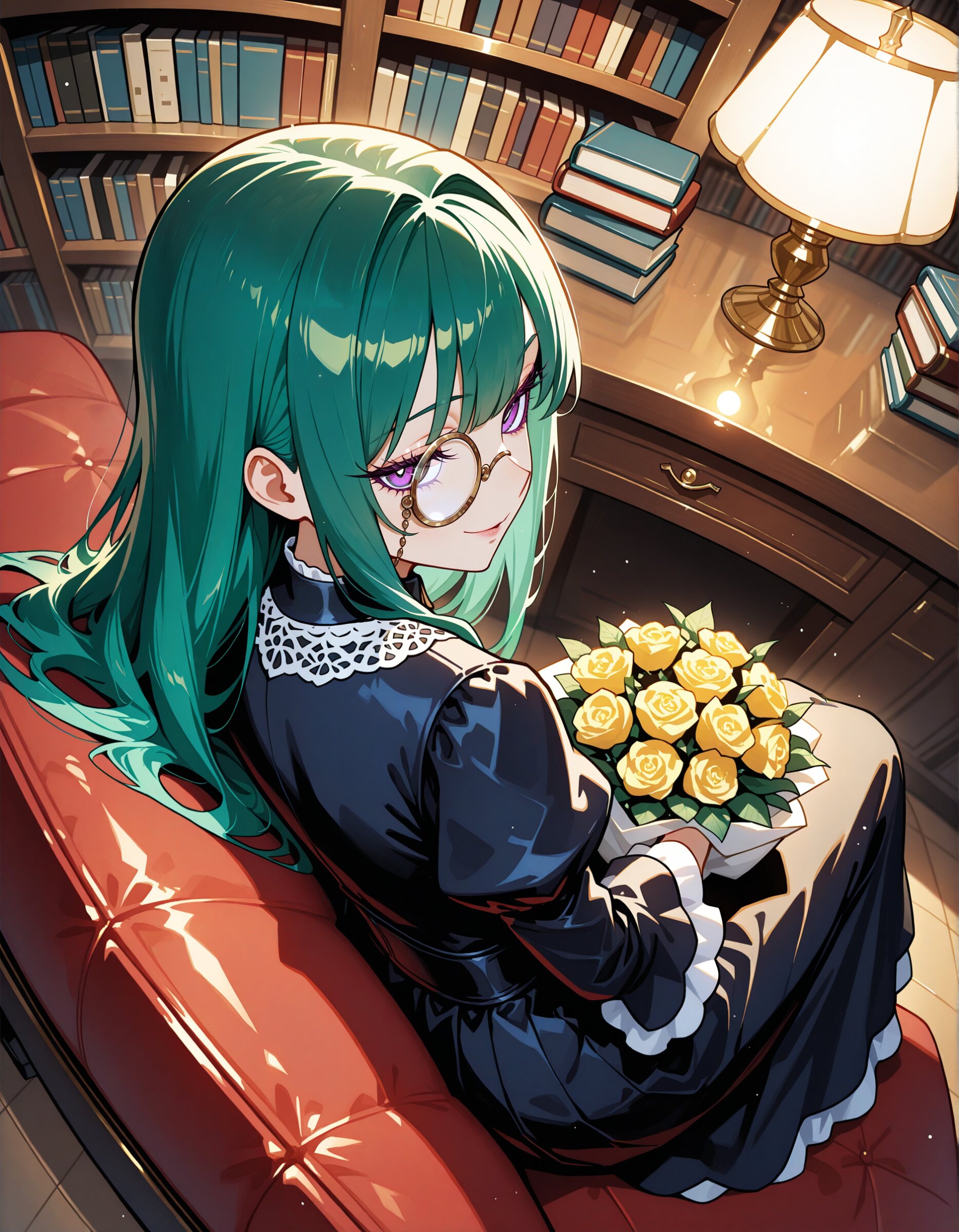 super fine concept art, hard surface, 8K, masterpiece, best quality, amazing quality, very aesthetic, absurdres, Over the Shoulder Shot, looking back, (fisheye,fisheye lens angle:1.0), (from above:1.1) , (dutch angle:1.2), library, lamp, zentangle, 1 lady, long hair, (green hair:1.0),((monocle)), purple eyes, (gothic lolita, black cloth),, ,seductive smile, (teasing smile:1.15), cool bridal sleeves holding_bouquet lace_trimmed , ink wash painting, on side, professional art lots of details, , overexposure, sumi-e effect style, <lora:noline (1):-0.5> <lora:sdxl2-flat2-512b:0.0> <lora:facelightup_xl_v10:0.5>