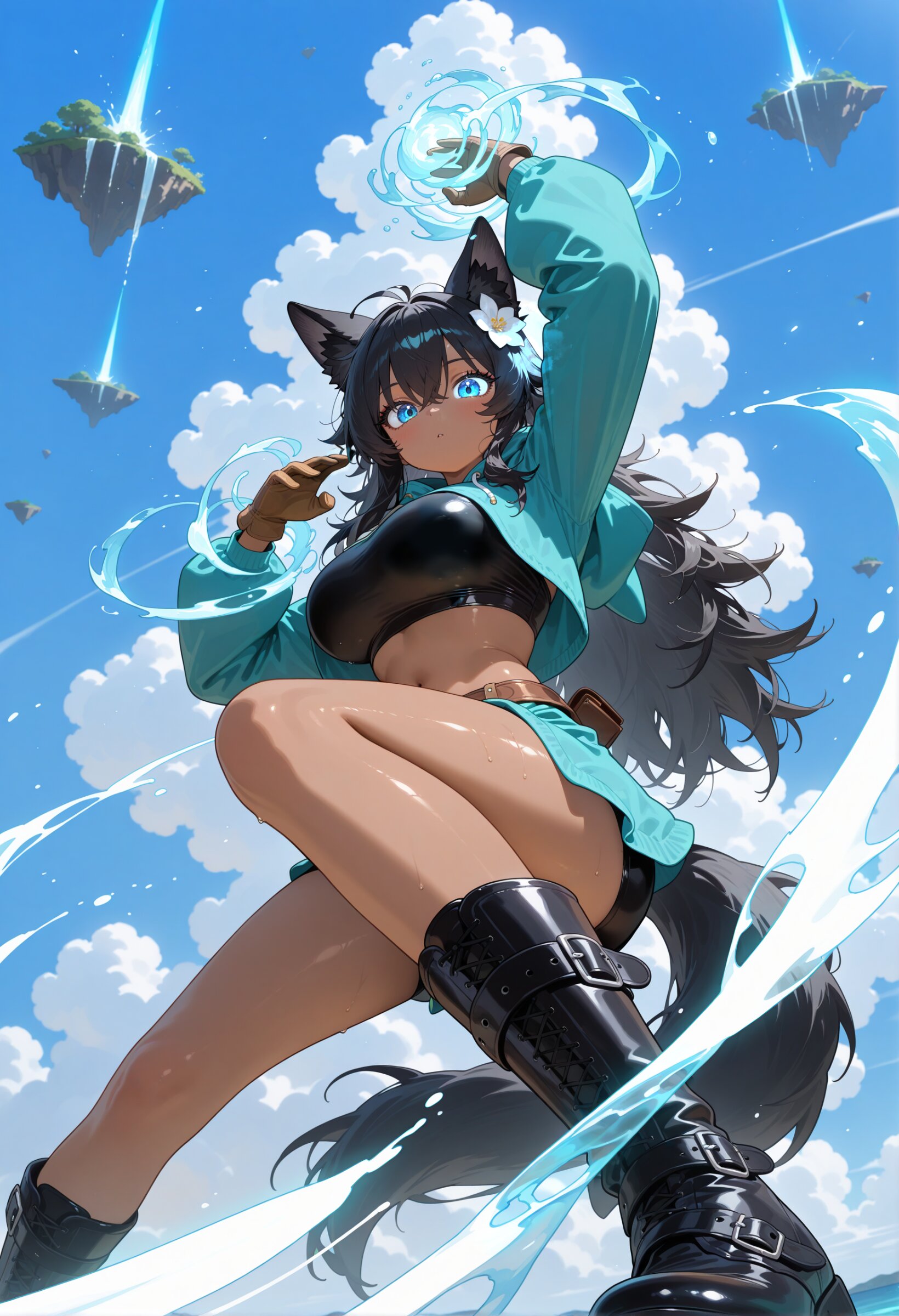 (close to viewer:1.2), knees out of frame from below, looking down looking at viewer, floating island, medieval fantasy world, waterfall, overgrown 1girl, black wolf ears, dark skin, young beautiful girl, large breasts, tall, wolf tail, (aristocratic features), (Black Hair:1.2) (disheveled long hair over ears:1.3) messy hair ornament flower, (perfect turquoise eyes:1.3) long eyelashes,, wearing turquoise hood down and white tube top leather gloves, lether miniskirt, belt boots, turquoise hoodie, water magic, , kung fu attack, kung fu pose, kung fu action, (swirling energy,energy magic,energy:1.2), water magic, create water lance, great clear water, reflective water, , 8K, unreal engine, masterpiece, best quality, amazing quality, very aesthetic, absurdres you can add scenery, (volumetric lighting), To make the background more distinctive. professional art lots of details, , overexposure, shiny-glistening, (watercolor style:0.0), (pastel color style:0.5) <lora:noline (1):-0.5> <lora:sdxl2-flat2-512b:0.2> <lora:facelightup_xl_v10:0.5>