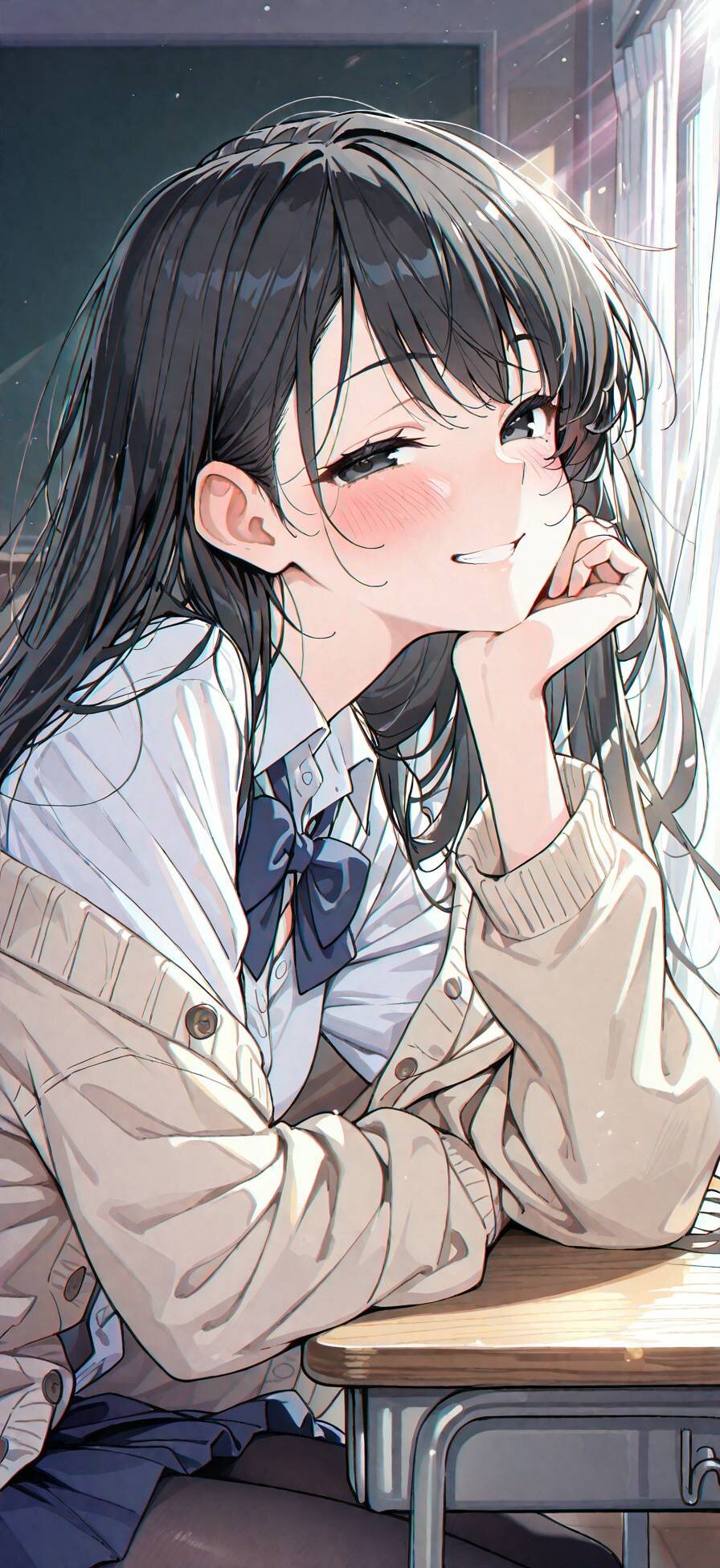 POV,japanese,classroom,desk,blush, grin,from side,sunlight,head rest,school girl,(one girl),white dress shirt,navy skirt,black pantyhose,bow tie,beige cardigan,looking viewer,perfect face,cute, black hair,(long hair),black eyes, half closed eyes,tindal effect,curtain,wind.
