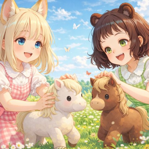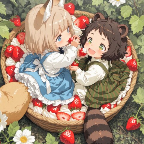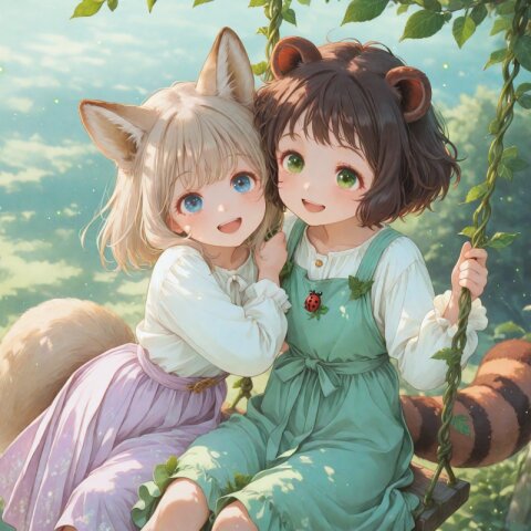 2girls, loli, mid, general, traditional media, picturebook-style, (colored pencil drawing), soft tone, (blurred boundaries, drawing lines, Paper texture), cute, deformed, (masterpiece, best quality), dynamic pose, dynamic angle, dynamic composition, looking away , sitting in a colorful pile of candy, cookies, sweets, sparkling eyes, joyful expressions, surrounded by glowing sparkles, golden magical light effects, shimmering particles, warm soft lighting, (barasui:0.1), (oyari ashito:0.1), BREAK 2girls, loli, light brown hair, medium hair, blue eyes, fox ears, fluffy fox tail, pink pinafore dress, happy, smile, BREAK 2girls, loli, messy hair, dark brown hair, short hair, green eyes, raccoon ears, striped raccoon tail, green pinafore dress, happy, laughing,