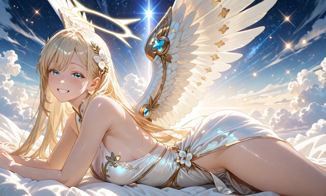 score_9, score_8_up, score_7_up, source_anime, masterpiece, amazing quality, very aesthetic, high resolution, ultra-detailed, absurdres, scenery, 2d, semi-realistic, unity engine, moe heroine, anime style, sharp focus, nice hands, perfect hands, perfect anatomy, perfect structure, (1girl, solo, no humans), dynamic composition, (background is The world of the sky, far above), (((A mysterious and fantastical sight with countless particles of light and orbs floating up))), cool heroine, spread arms, spread wings, Flapping Wings, divine Angel dress with intricate embroidery and decoration made of radiance light and light particles, pure white angel wings, glowing, glitter, light particles, (gaze at me with excited expression, big smile), ((lying on stomach on above fluffy cloud, floating gracefully)), fantasy scenery, aerial view, cloud world, radiant, dreamy atmosphere, cowboy shot, from side, (gaze at me, close-up eyes, face focus), low angle, Her clothes and hair fluttering in the gentle breeze. ultra detailed lips, ultra detailed face and hair, kawaii, adorable, cute, angel girl, (apatite eyes with CGI Effect), (deep blonde hair:1.2), medium breasts, wide hip, BREAK, photorealistic, masterpiece, very aesthetic, high resolution, ultra-detailed, absurdres, newest, scenery, volumetric lighting, <lora:sdxl_neg_overfit_v1:0.7> <lora:elf-san alpha1:0.7> <lora:elf-san alpha4(IL1.0):0.7> <lora:hyper-sdxl-12.1-045-055-:1>