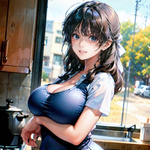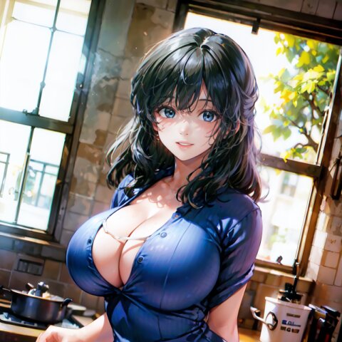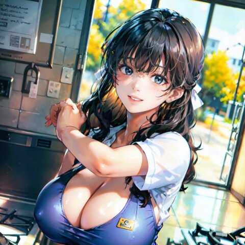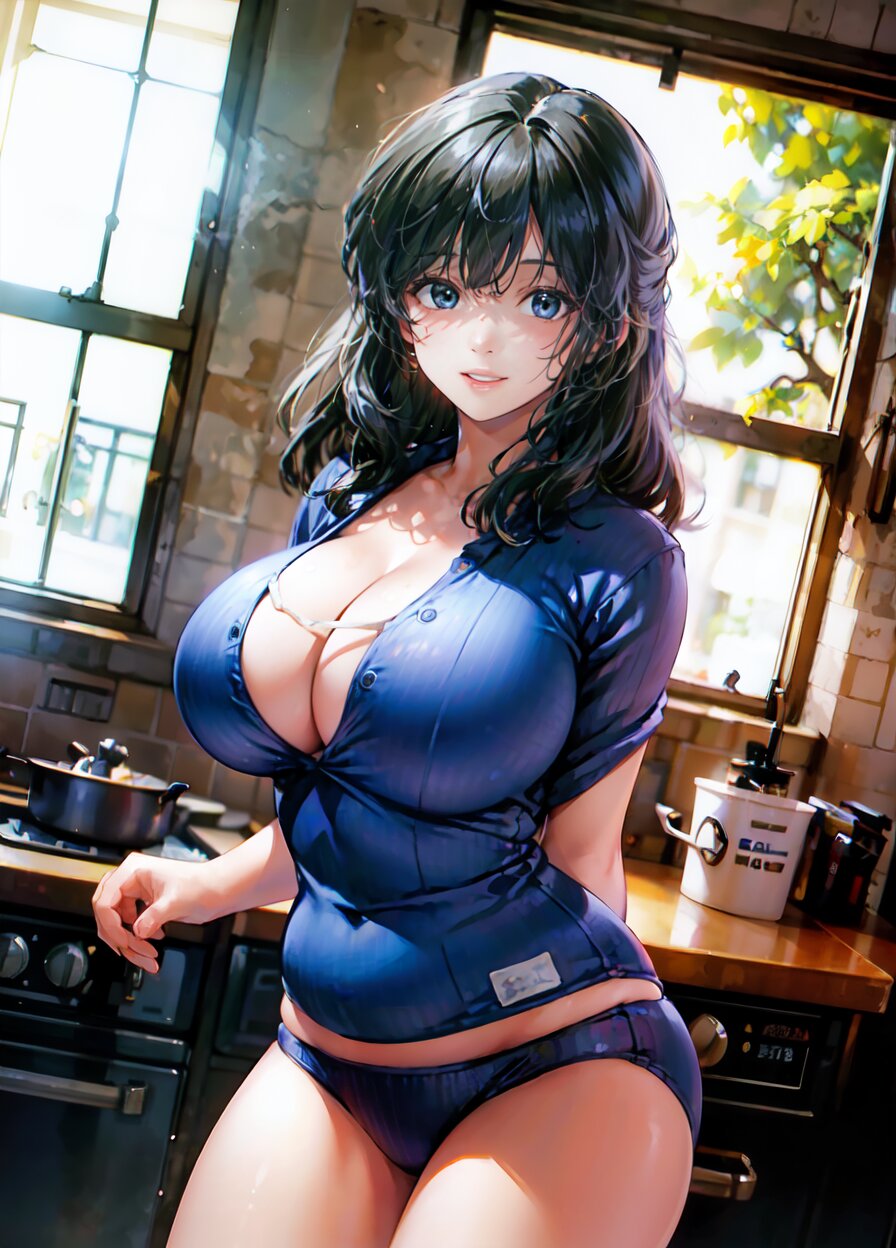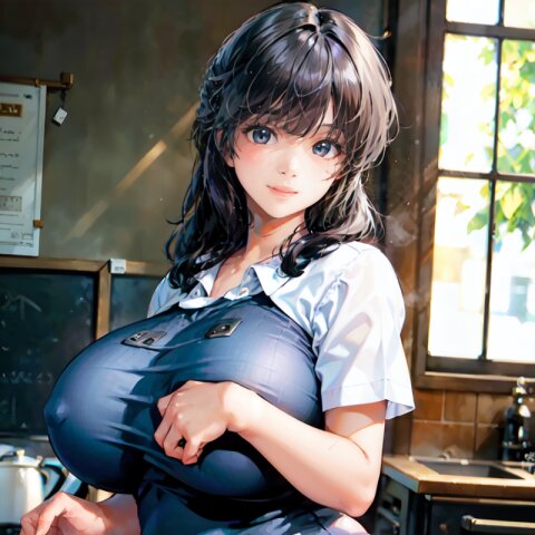 (((shot from front))), (8k, best quality, masterpiece:1), (realistic, photo-realistic:1.4), random pose, (random angle: 1.6), 1girl, 23 years old, primary school teacher, white blouse and panties, (chubby, huge breasts: 1.4), long hair, beautiful detailed face, (cowboy shot: 1.6), perfect skin, detailed skin texture, side of to the stove, (((inside of the primary school))), <lora:akina_v01:1>