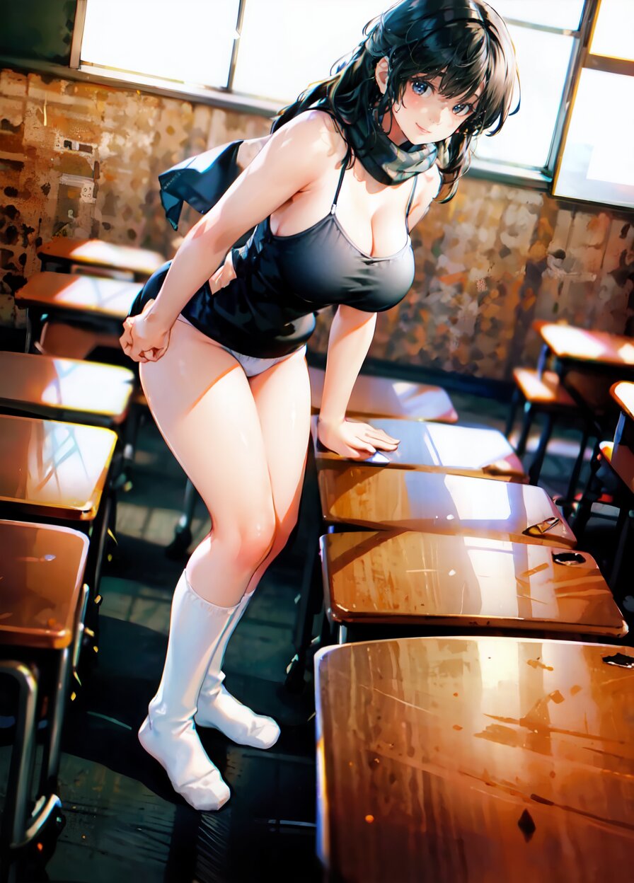 (((shot from front))), (8k, best quality, masterpiece:1), (realistic, photo-realistic:1.4), random pose, (random angle: 1.6), 1girl, 23 years old, primary school teacher, sweater and scarf, fur jacket, (chubby, huge breasts: 1.4), long hair, beautiful detailed face, (full body: 1.4), perfect skin, detailed skin texture, standing, (white camisole, panties, long socks: 1.4), (((at the dark school classroom))), <lora:akina_v01:1>