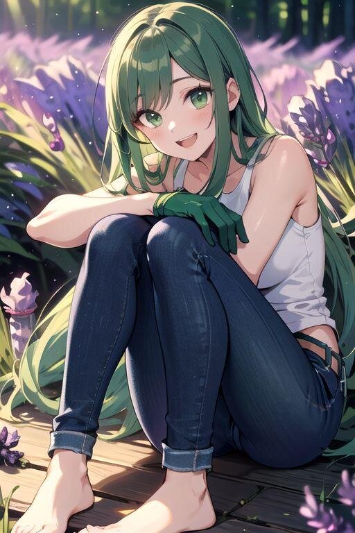 green hair, very long hair, green eyes, gloves, barefoot, (long toes:1.2), (long jeans:1.4),smile,open mouth, forest background, (lavender:1.5)