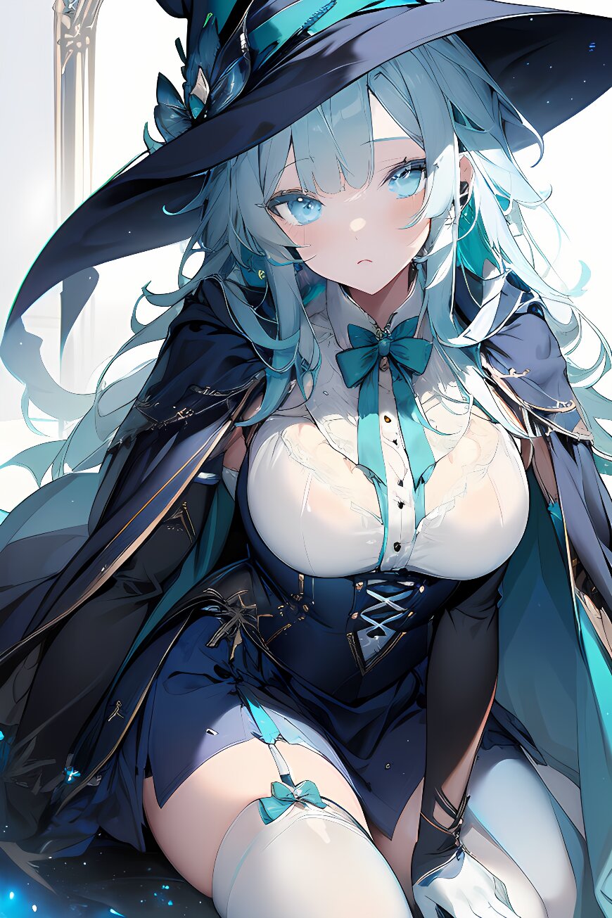 1girl, witch girl, blue eyes, beautiful iridescence eyes, beautiful detailed eyes, beautiful light blue hair, long bangs, long disheveled beautiful hair, first-rate female bodies, perfect body, beautiful breasts, framed breasts, cool face, (Beautiful Lips:0.7), (stylish beautiful witch dress:1.2), {detached sleeves|white elbow gloves}, (cute {dark blue and white|blue and dark blue} witch girl costume:0.9), (white blouse:1.3), bow tie, witch long skirt (overskirt:1.1) {blue cloak|black cloak|{white|green|aqua} cape}, (blue galaxy witch hat:1.1), lace-up boots on feet, stockings and suspenders,,Art Style 2.0,pastellio, pastel, kawaii pastels