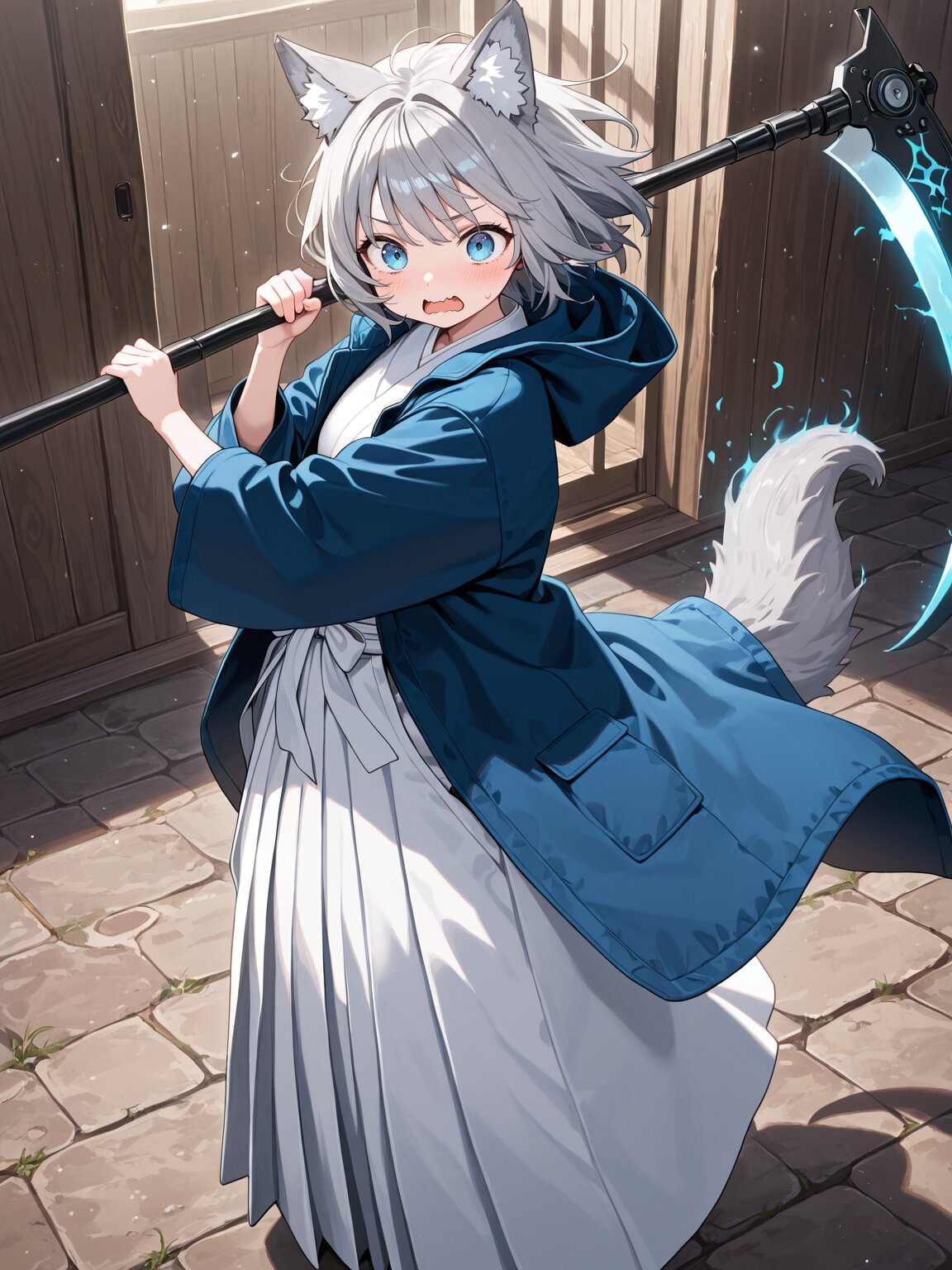 cute, animal ears, wolf ears, wolf tail, short hair, gray hair, floating hair, blue eyes, deep blue coat, hooded coat, hooded down, hakama skirt, white hakama, tail raise, holding scythe, dyanamic pose, open mouth, wavy_mouth, aura