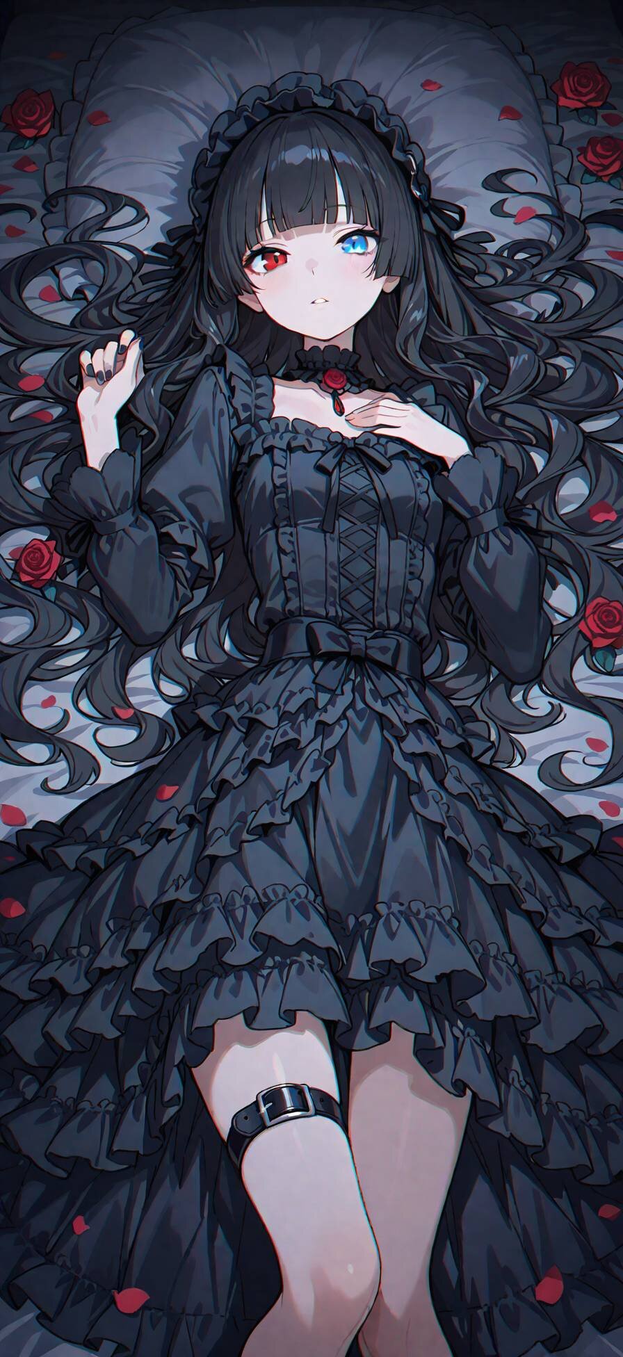 lying,bed,cowboy shot, (gothic dress),one lady,choker,thigh belt,skirt,headdress,dark room, rose,looking viewer,perfect face,cute,black hair,(heterochromia,red eye,blue eye),blunt bangs,wavy hair,long hair,parted lips.