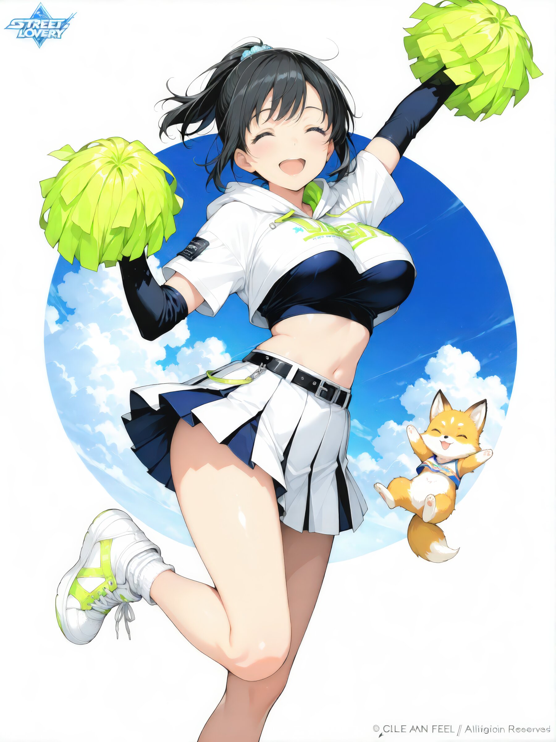 Best quality, Masterpieces, simple background, negative space, anime-style illustration, white background, fine detail, (young girl), cute face and eyes, big breasts, black hair, clear black eyes, single short ponytail hair, cute and lovely, Vigorous, lively, and spontaneous personality, smile, open mouth, closed eyes, cheerleader outfit with street fashion elements, black and neon green color combo, cropped hoodie top, pleated skirt with belts, logo patches, arm warmers, chunky sneakers, edgy and urban feel, cinematic angle, dynamic pose, official wallpaper, Summer Atmosphere, soft cloudy sky background, light blue and white, minimal and dreamy, cheering, with cute fox cub