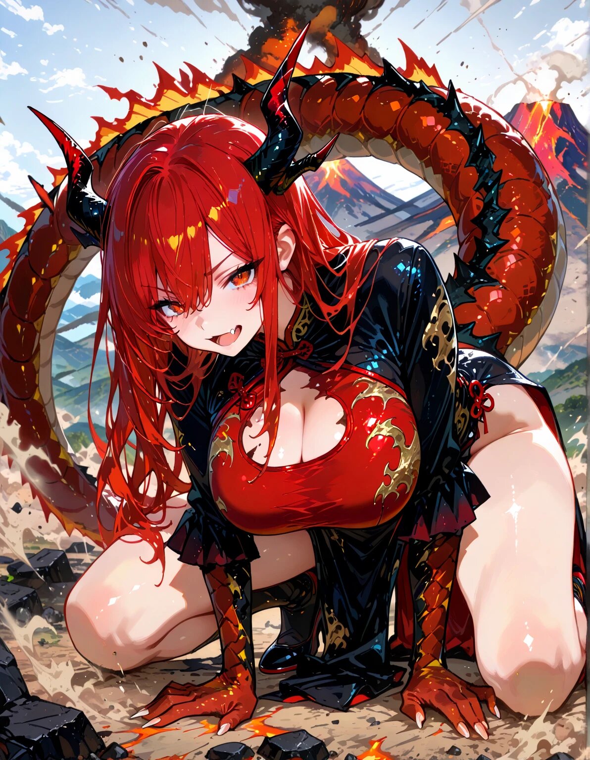 fantasic illustrations,dark fantasy,volcano mountain,magma,1girl,solo,center,looking at viewer,(dragon lady),red hair,long hair,wavy side hair,energisch smile,wide open mouth,fang,leaning forward,red chinese dress,scaled dress,huge breasts,scaled big dragon tail,scaled dragon hands,big nails,hands on ground,cracking ground,dust,magma splash,black rough dragon horns,((masterpiece, best quality, extremely detailed, absurdres)),