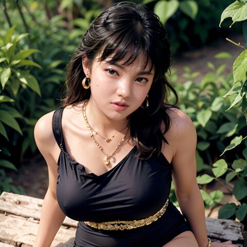 (cowboy shot, from below: 1.6), (8k, best quality, masterpiece:1.4), (realistic, photo-realistic:1.6), HDR, (incredibly absurdres:1.2), (vibrant color:1.2), ultra-detailed, 1woman, solo, 18 years old, slender, (saggy gigantic breasts: 1.6), long hair, perfect body, highly detailed, shiny hair, looking at viewer, (gold decoration dress, black panties and tights, necklace and earrings: 1.6), (sitting on wood chair, wide spreading legs: 1.2), in the summer garden, <lora:aka_v01:0.8>