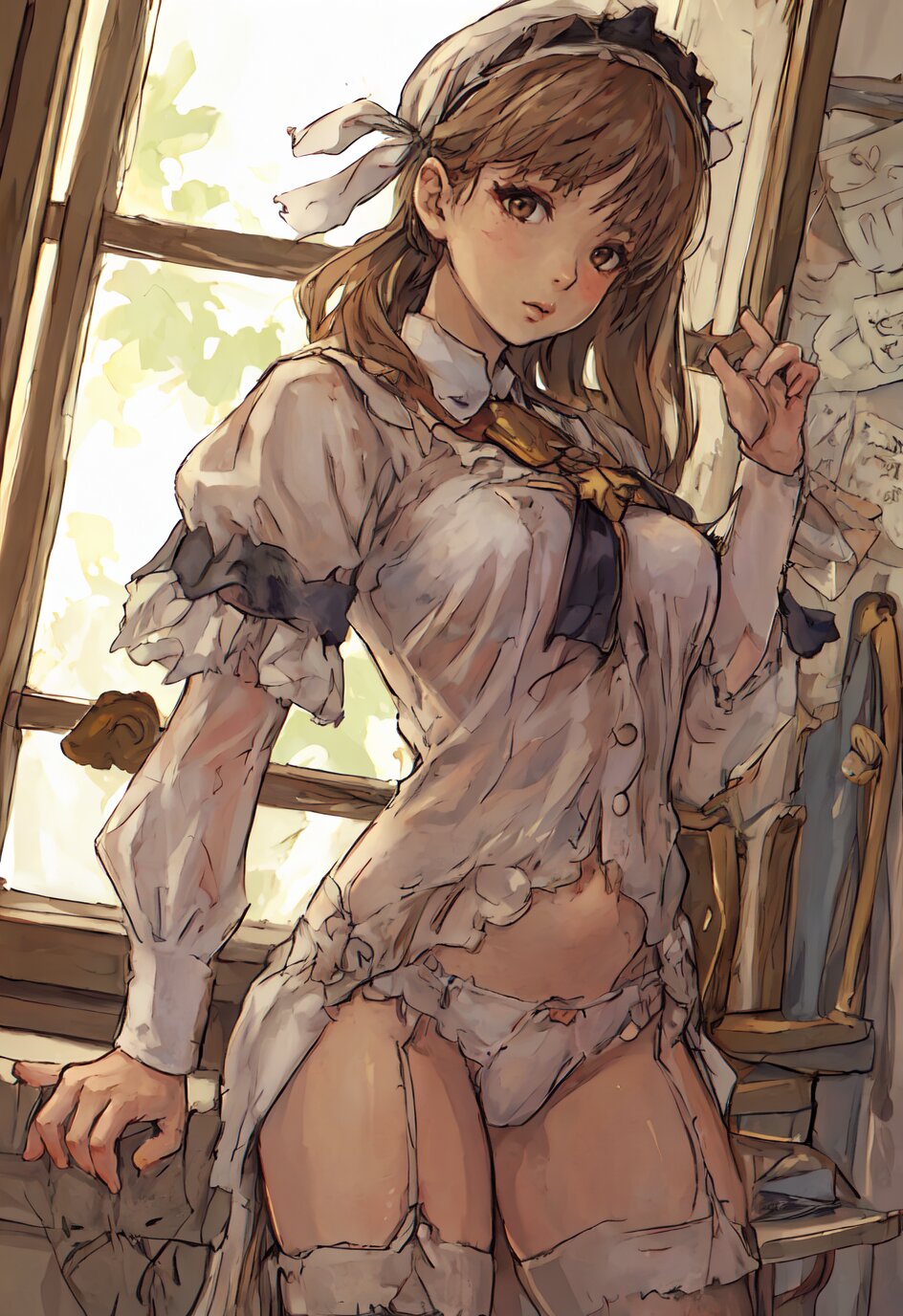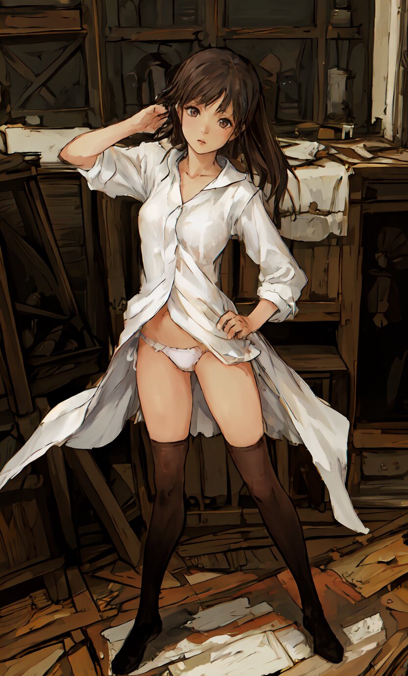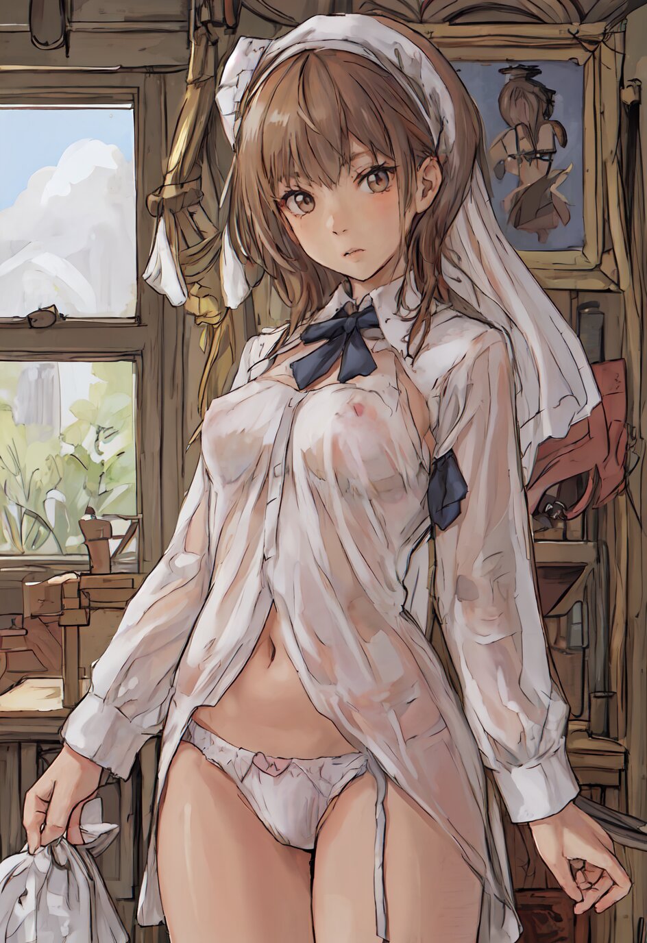 nsfw, nude, (8k, best quality, masterpiece:1.4), (realistic:1.8), HDR, (incredibly absurdres:1.2), ultra-detailed, (random pose, random angle: 1.8), 1girl, solo, 18 years old, painter, (gigantic breasts: 1.4), (white shirt, open chest, sexy panties: 1.6), ponytail, (cowboy shot: 1.4), perfect body, highly detailed, shiny skin, shiny hair, looking away, (in the Atelier: 1.6), <lora:akih_v01:0.6>