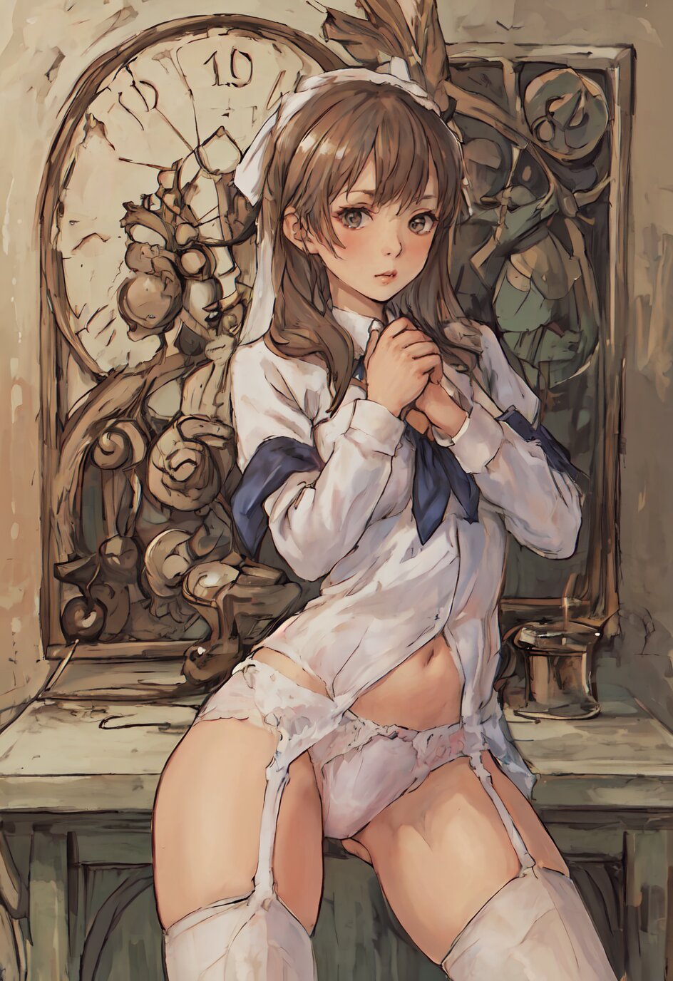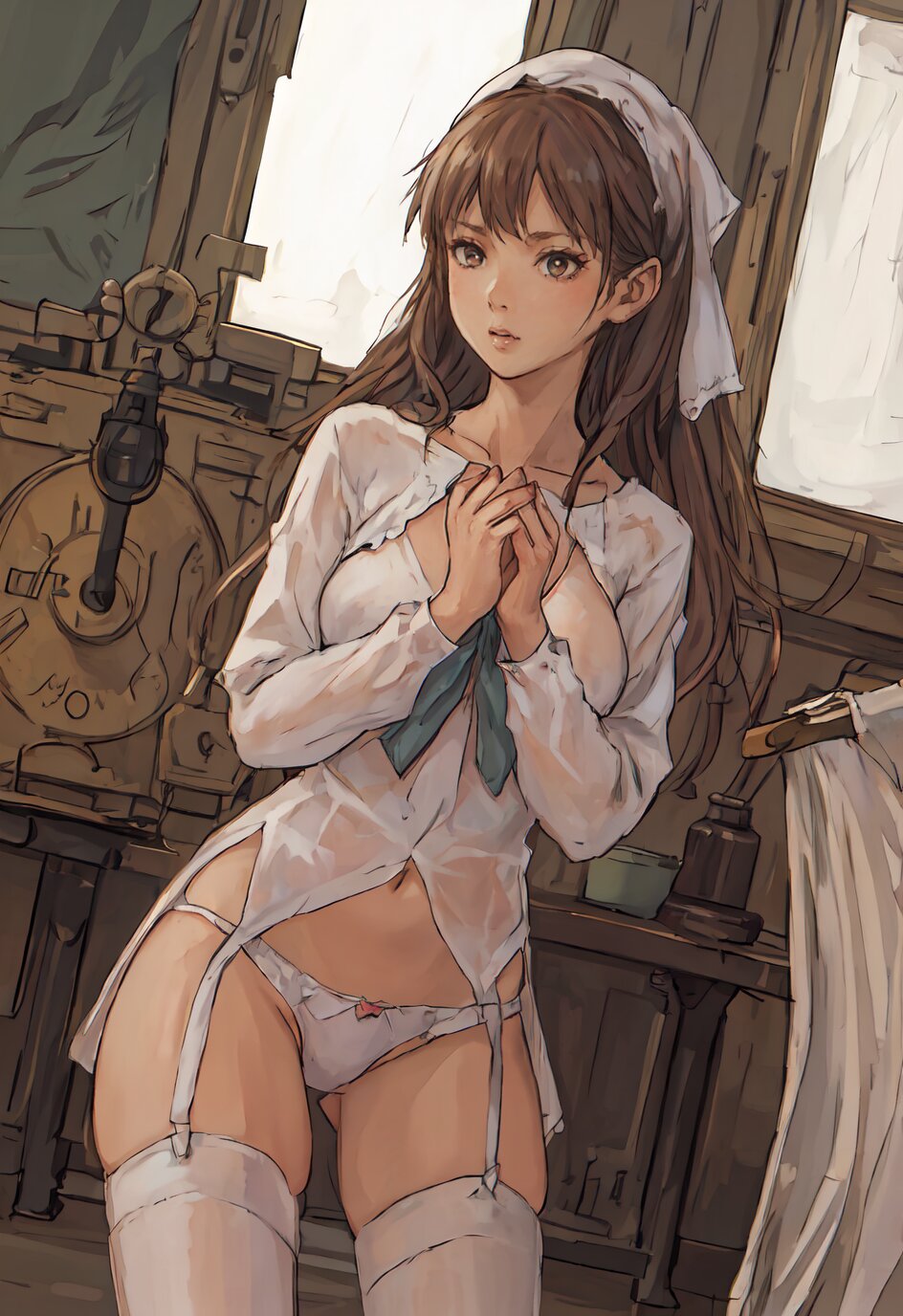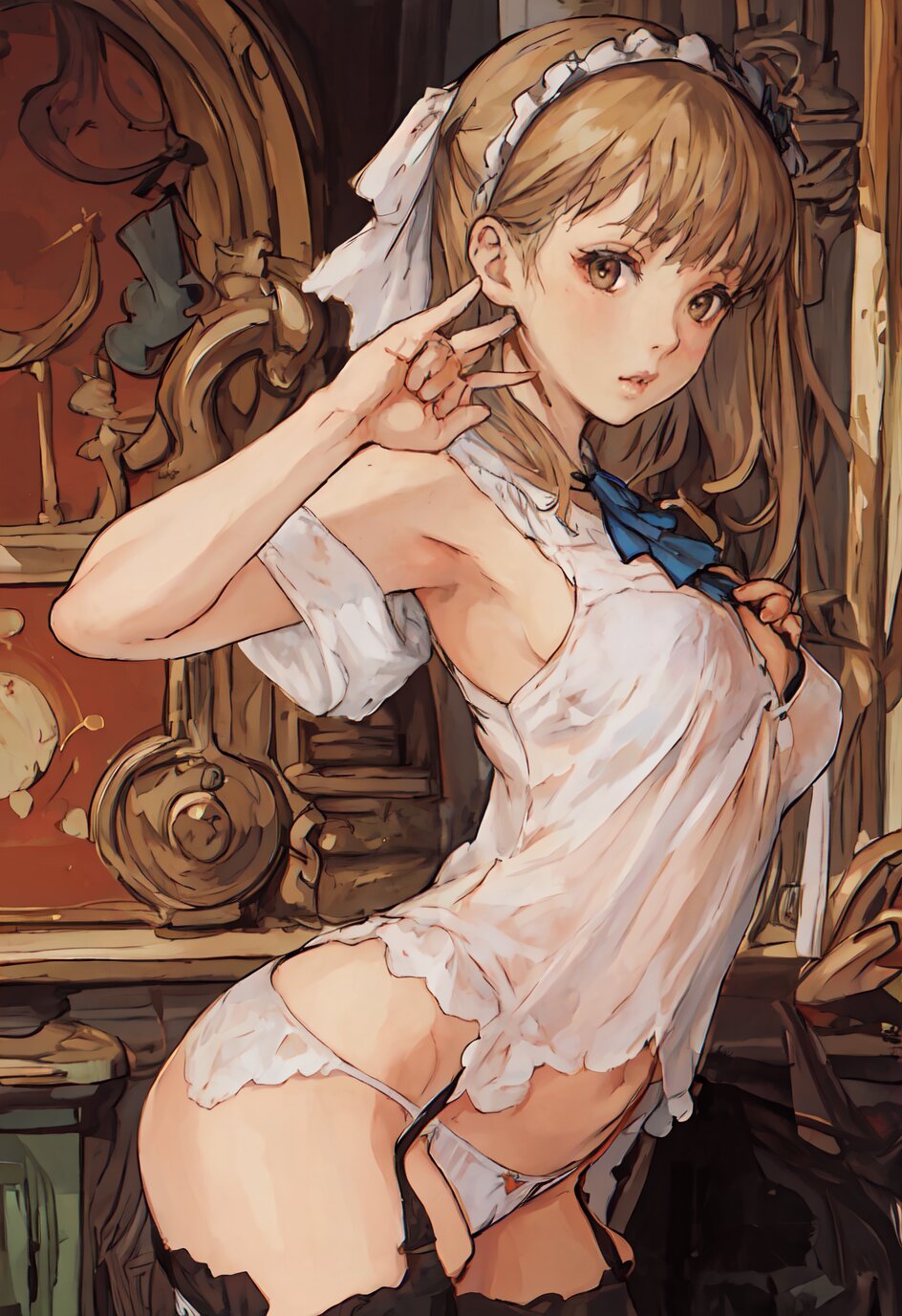 nsfw, nude, (8k, best quality, masterpiece:1.4), (realistic:1.8), HDR, (incredibly absurdres:1.2), ultra-detailed, (random pose, random angle: 1.8), 1girl, solo, 18 years old, painter, (gigantic breasts: 1.4), (white shirt, open chest, sexy panties: 1.6), ponytail, (cowboy shot: 1.4), perfect body, highly detailed, shiny skin, shiny hair, looking away, (in the Atelier: 1.6), <lora:akih_v01:0.6>