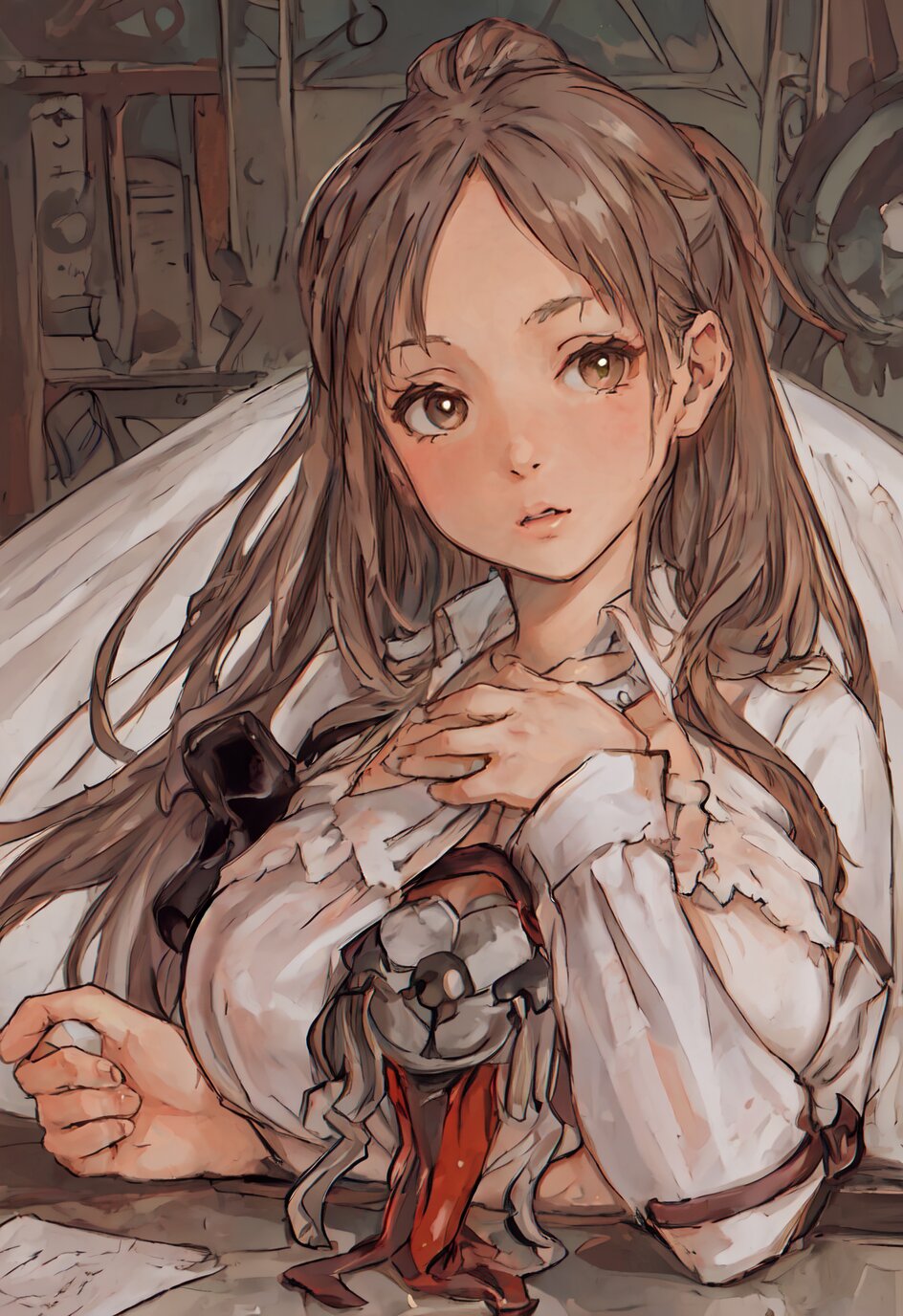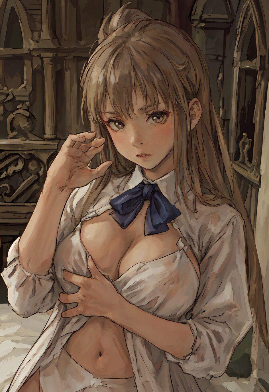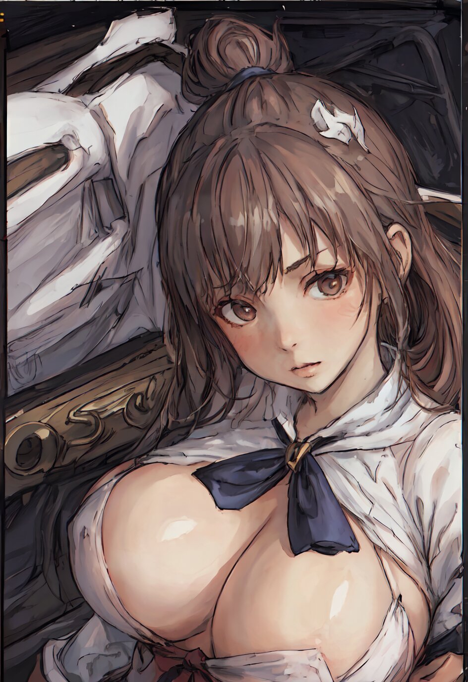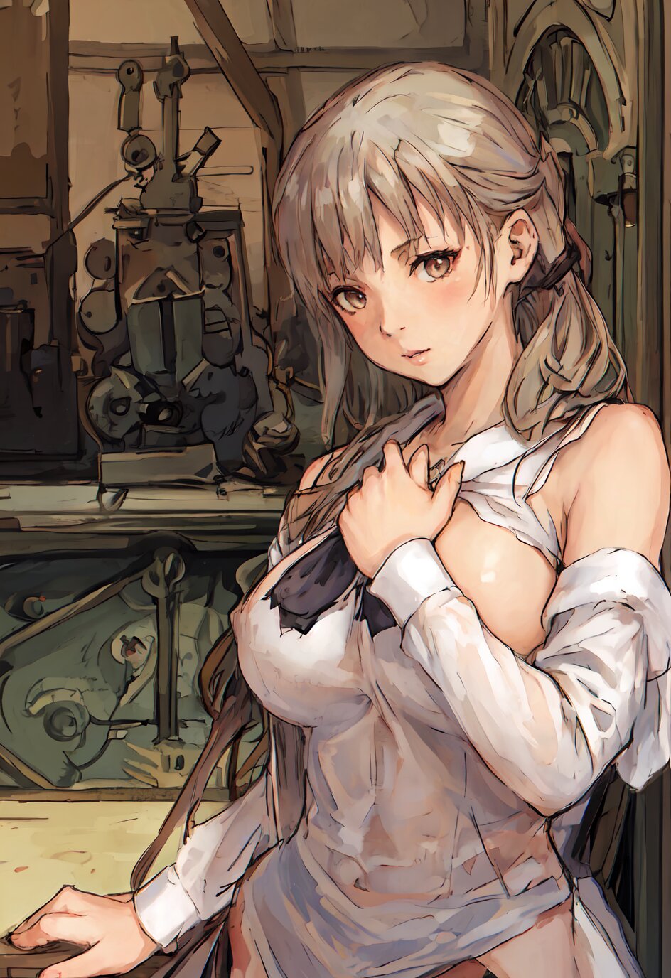 nsfw, nude, (8k, best quality, masterpiece:1.4), (realistic:1.8), HDR, (incredibly absurdres:1.2), ultra-detailed, (random pose, random angle: 1.8), 1girl, solo, 18 years old, painter, (gigantic breasts: 1.6), (white shirt, open chest: 1.6), ponytail, (upper body: 1.8), perfect body, highly detailed, shiny skin, shiny hair, looking away, (in the Atelier: 1.6), <lora:akih_v01:0.6>