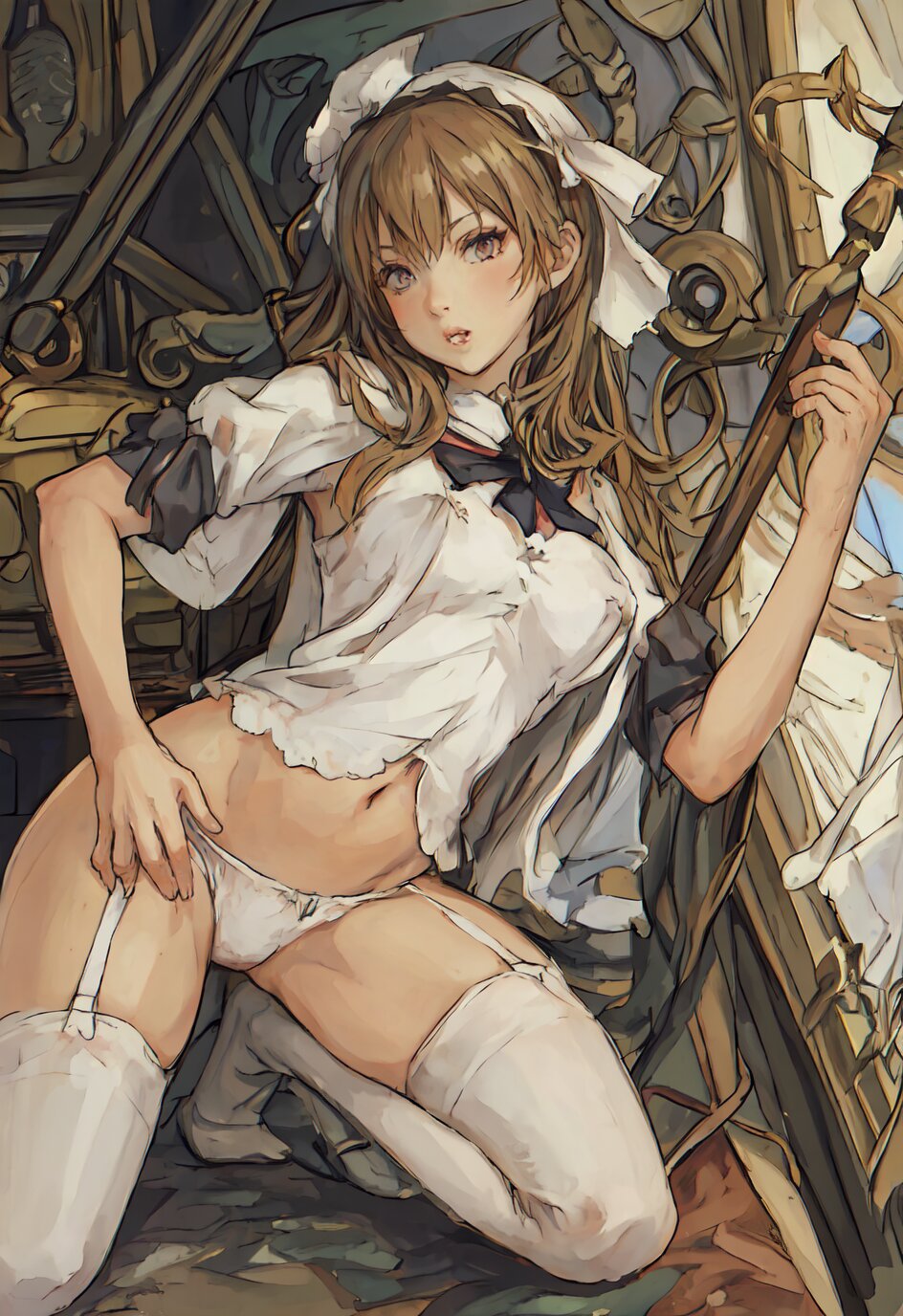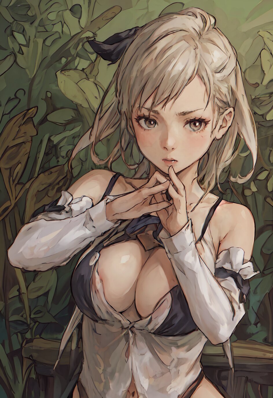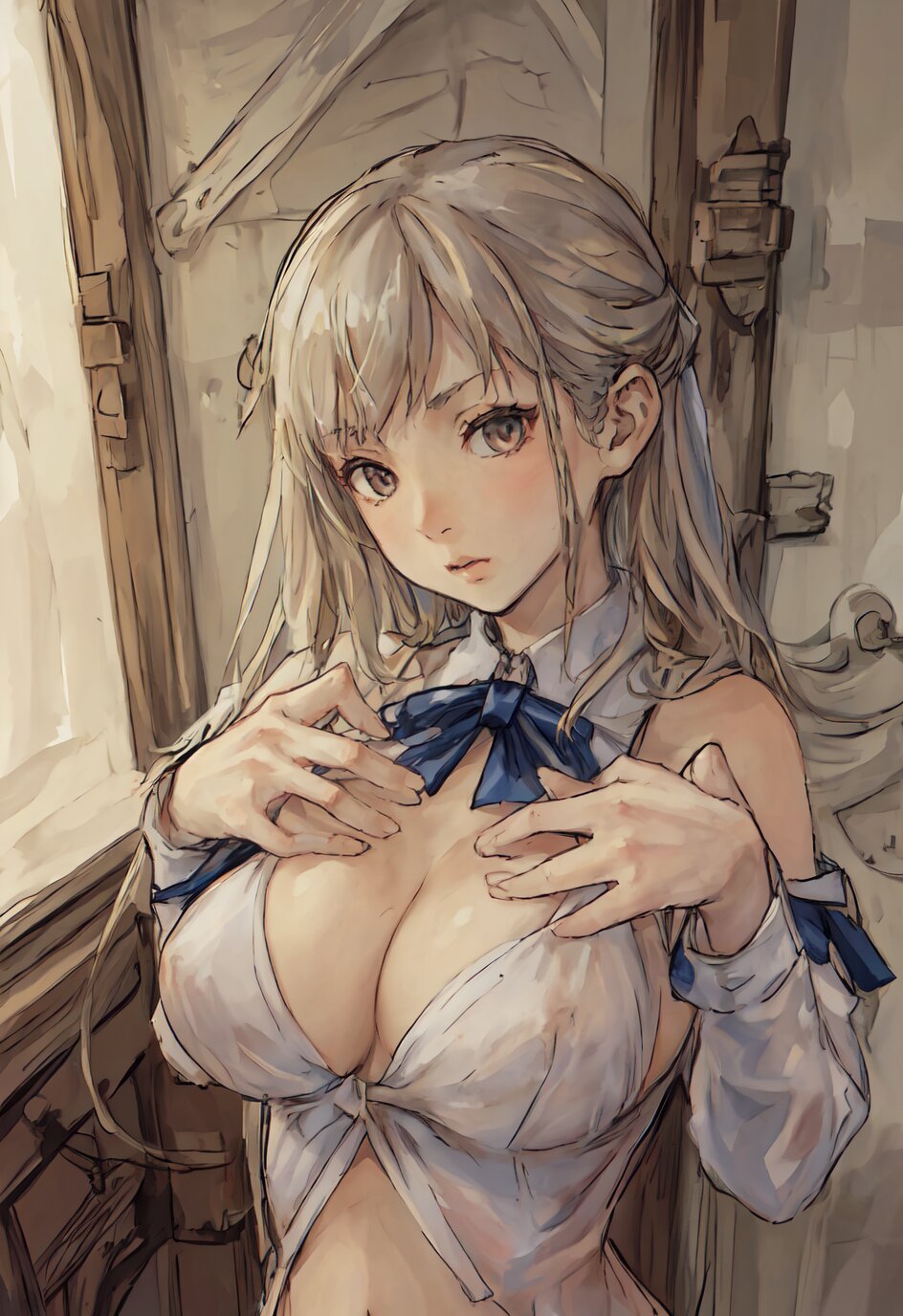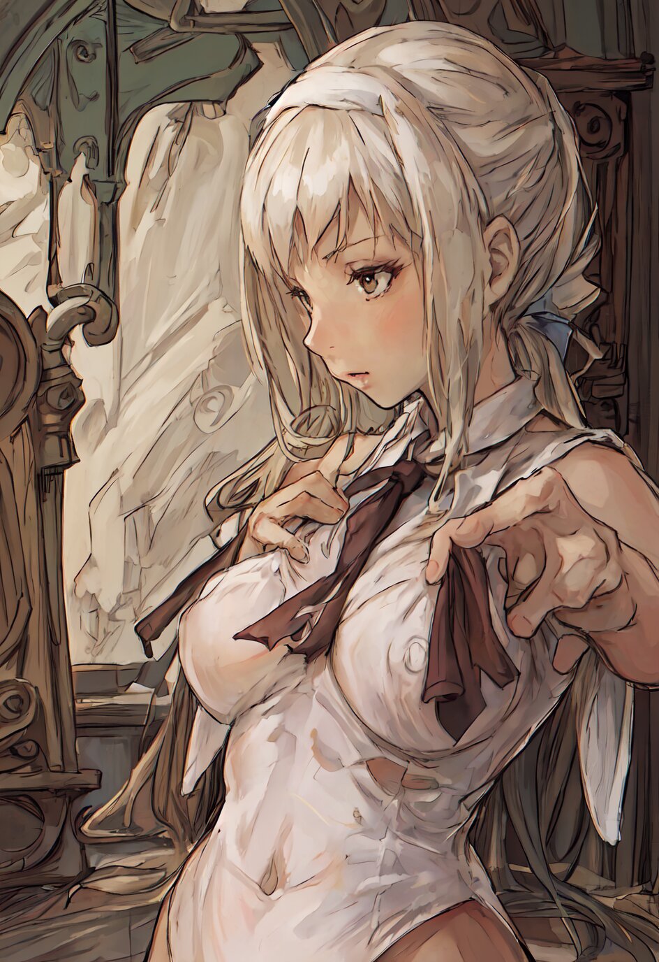 nsfw, nude, (8k, best quality, masterpiece:1.4), (realistic:1.8), HDR, (incredibly absurdres:1.2), ultra-detailed, (random pose, random angle: 1.8), 1girl, solo, 18 years old, painter, (gigantic breasts: 1.6), (white shirt, open chest: 1.6), ponytail, (upper body: 1.8), perfect body, highly detailed, shiny skin, shiny hair, looking away, (in the Atelier: 1.6), <lora:akih_v01:0.6>