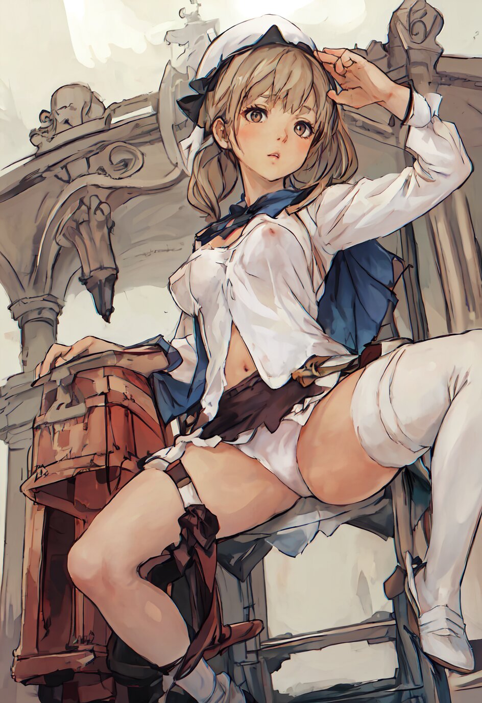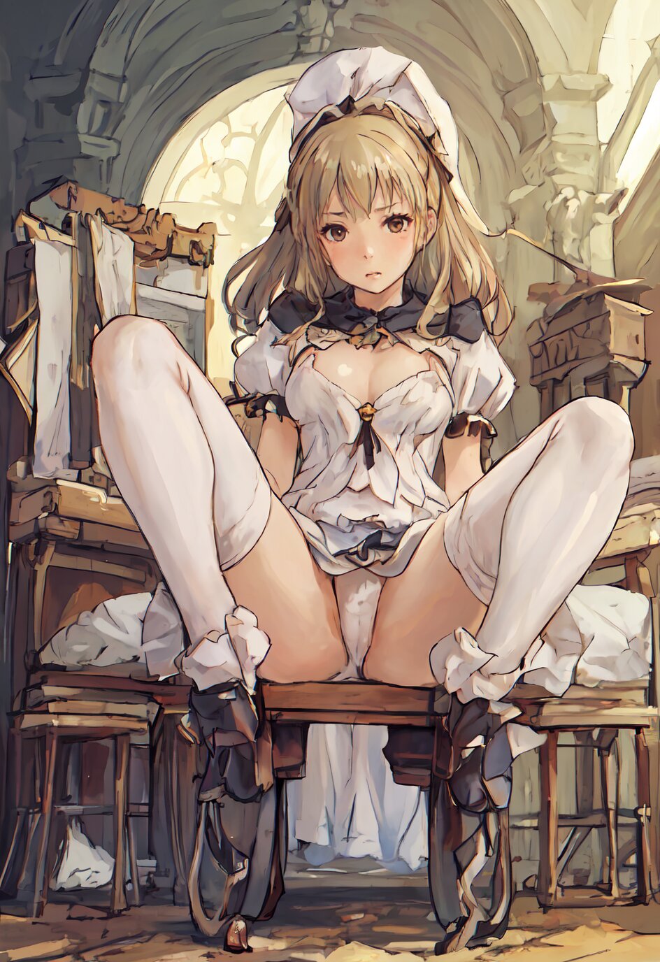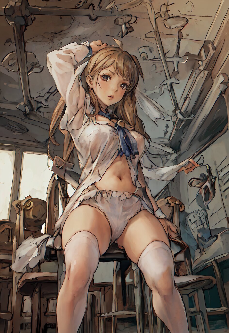 nsfw, nude, (8k, best quality, masterpiece:1.4), (realistic:1.8), HDR, (incredibly absurdres:1.2), ultra-detailed, (random pose, from below: 1.8), 1girl, solo, 18 years old, painter, (gigantic breasts: 1.6), (white shirt, open chest: 1.6), ponytail, full body, perfect body, highly detailed, shiny skin, shiny hair, looking away, (sitting on wood chair, wide spreading legs, in the Atelier: 1.6), <lora:akih_v01:0.6>