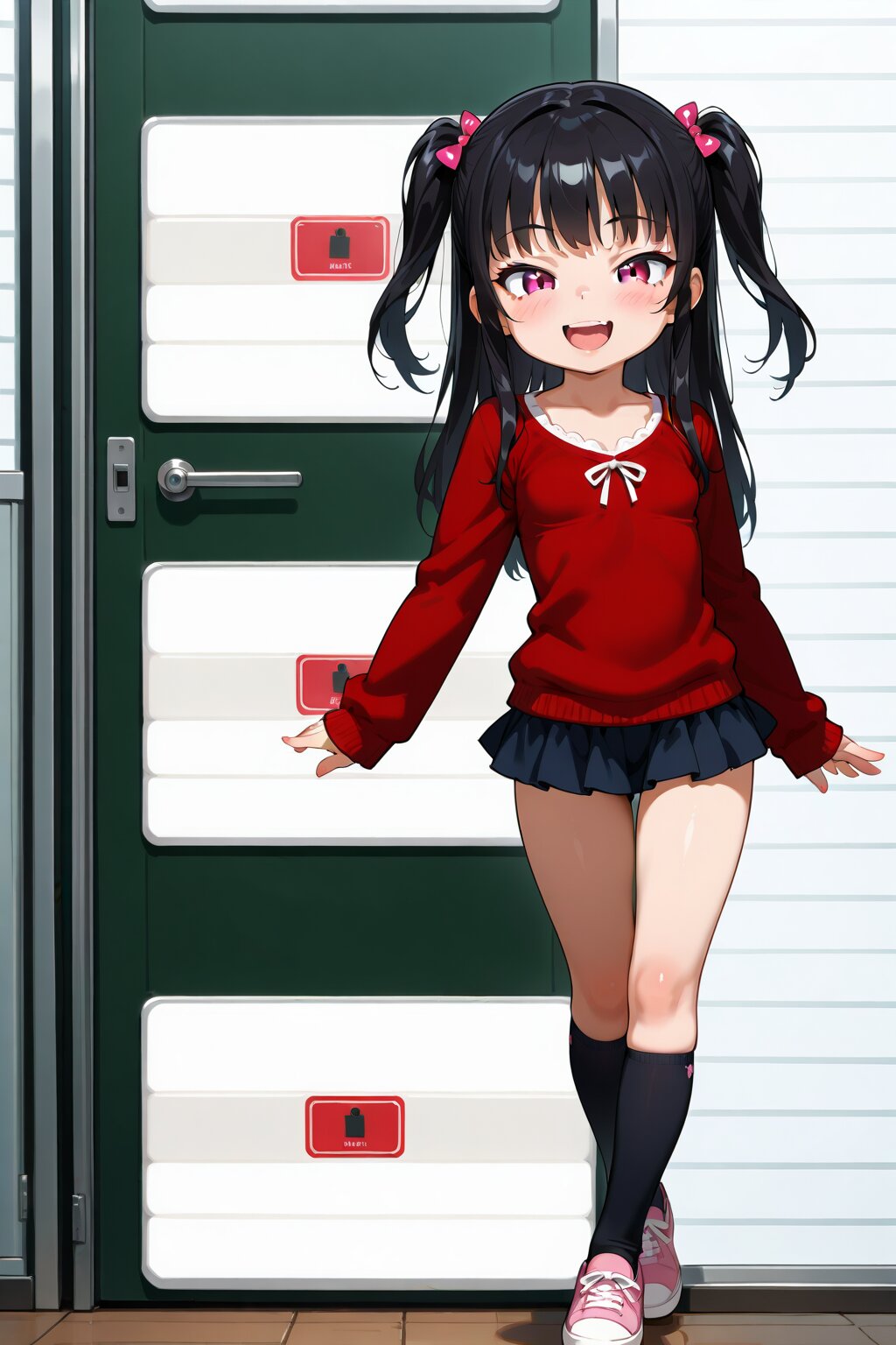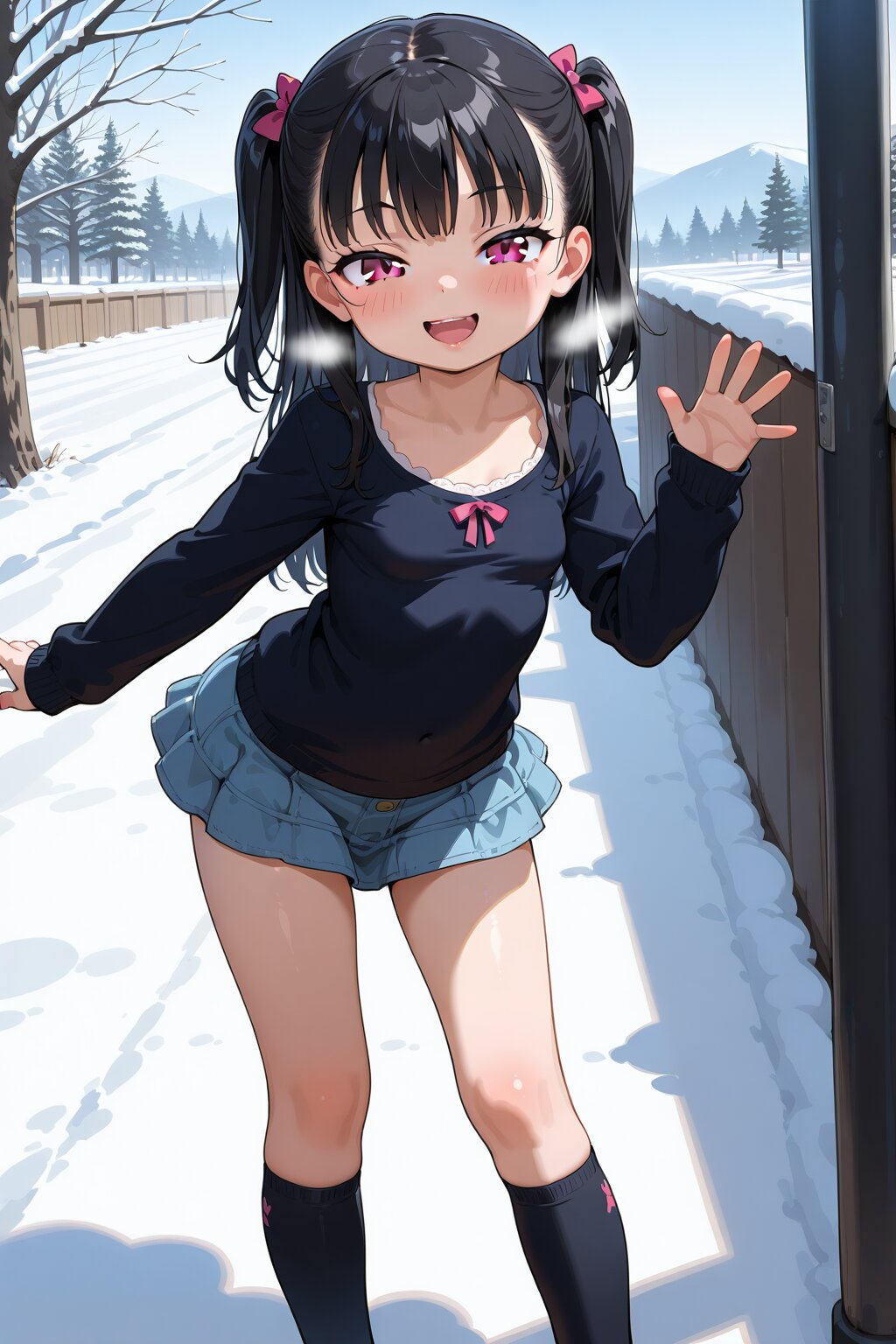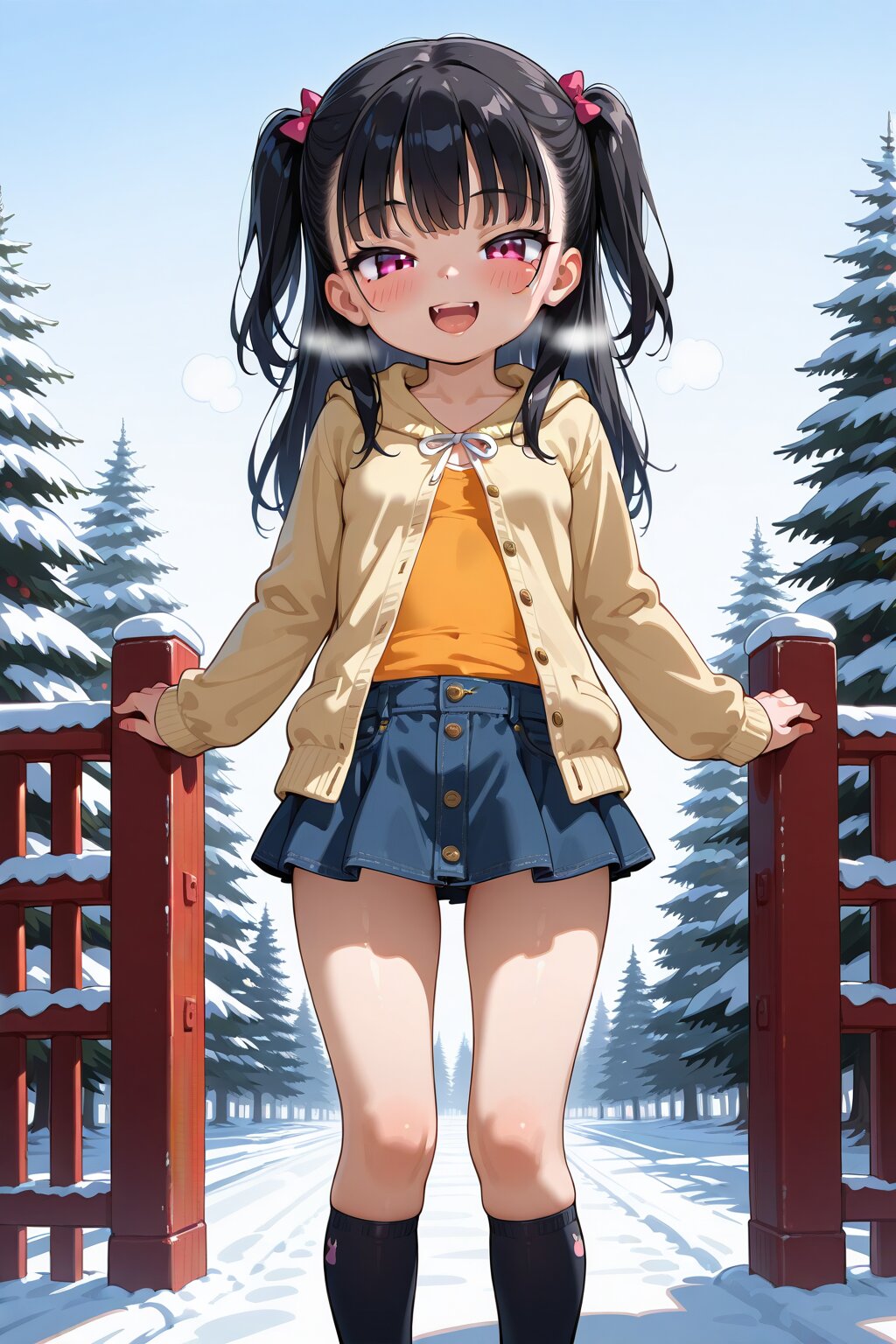 casual,miniskirt,kneehighs,:d,Two Side Up Hair,1girl,loli,bishoujo,mesugaki,underage,black hair,small_breasts,slender_waist,Winter