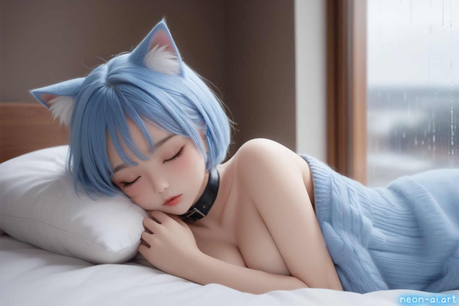 sweater, fluffy sweater, aran sweater, off-shoulder, sleeveless, strapless, soft texture, detailed texture, expressionless, closed eyes, lying on back, on bed, indoor, window, rain, cloudy,