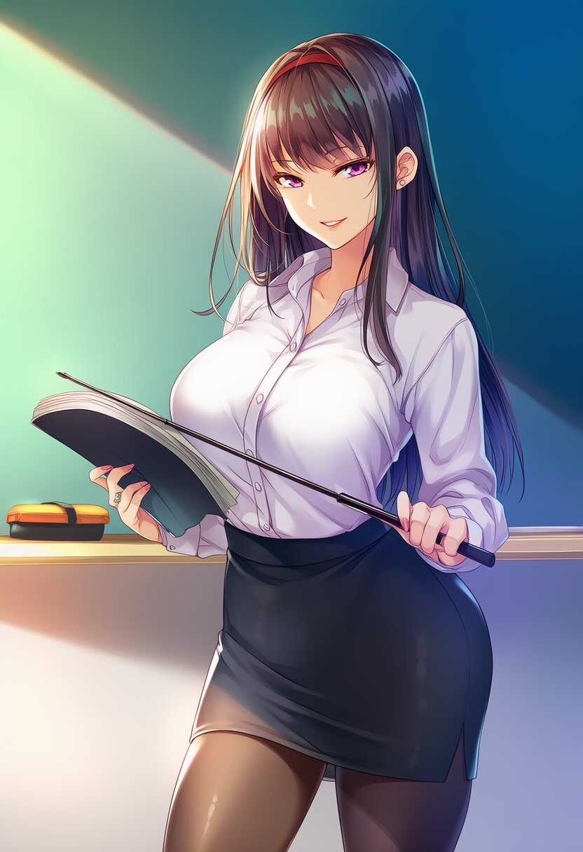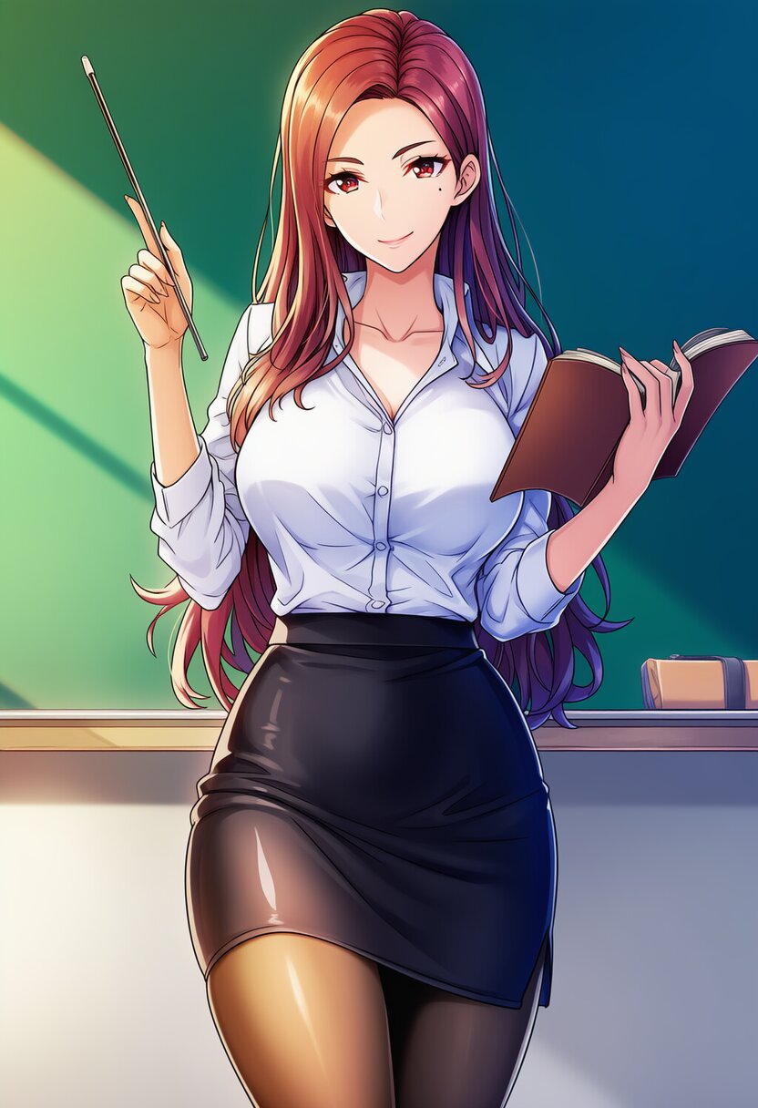25 years old, female, teacher, Shostakovich, book, shirt, Tight Skirt, beautiful detailed hair, beautiful detailed eyes, smile, classroom, official art, {{ultra-detailed}}, {{high resolution}}, dynamic fuzziness, colorful, hdr, , very aesthetic, masterpiece, no text